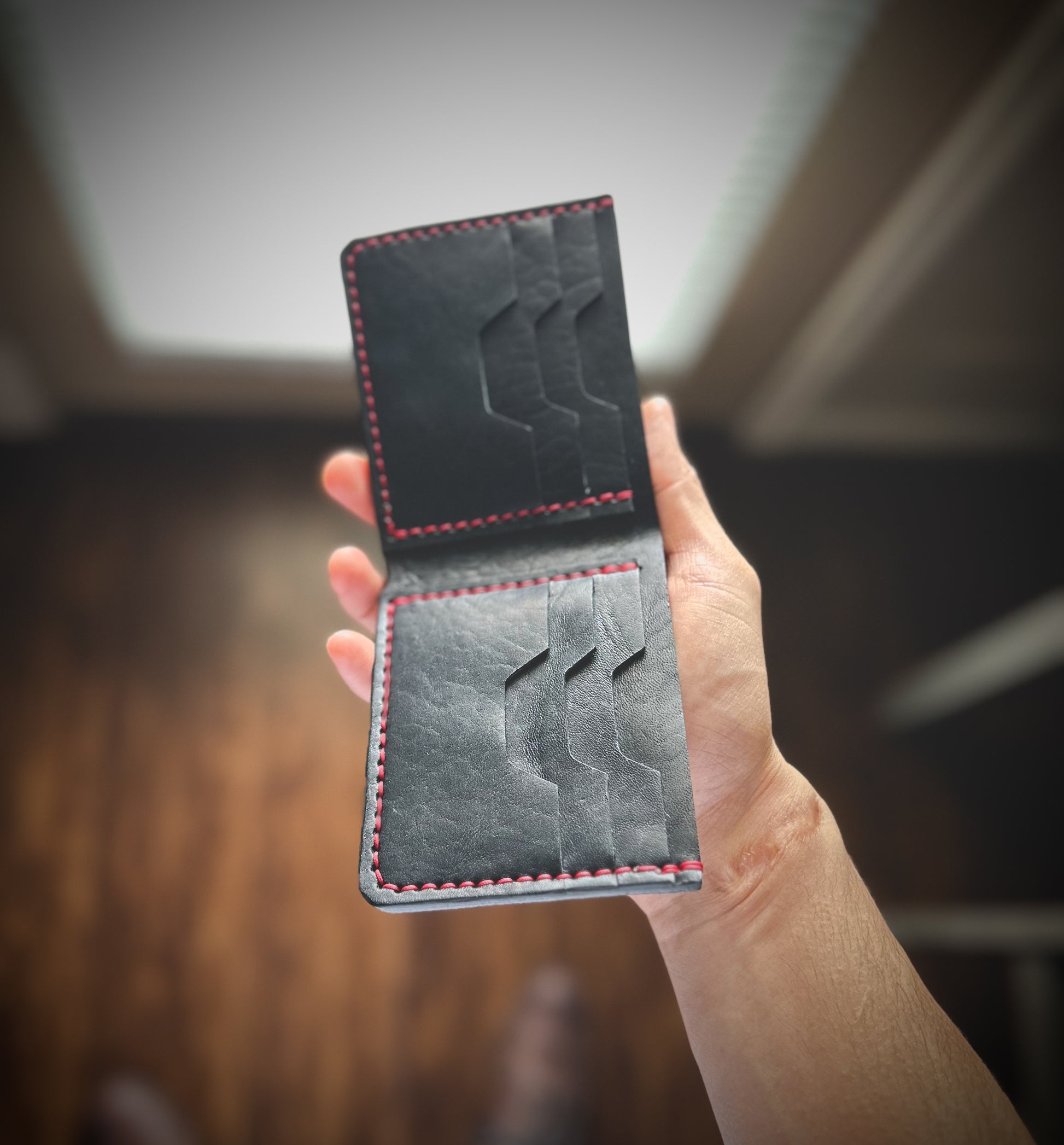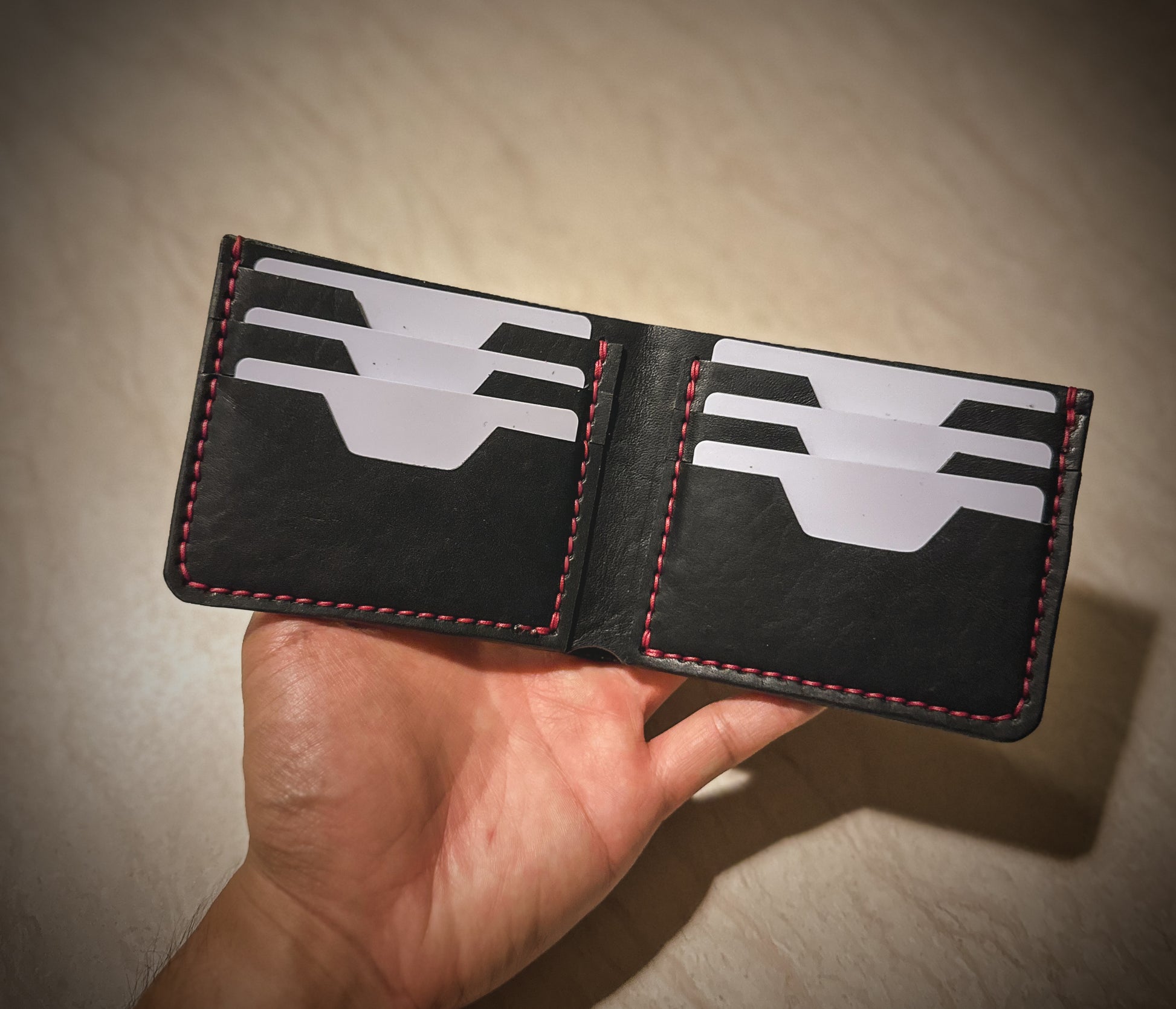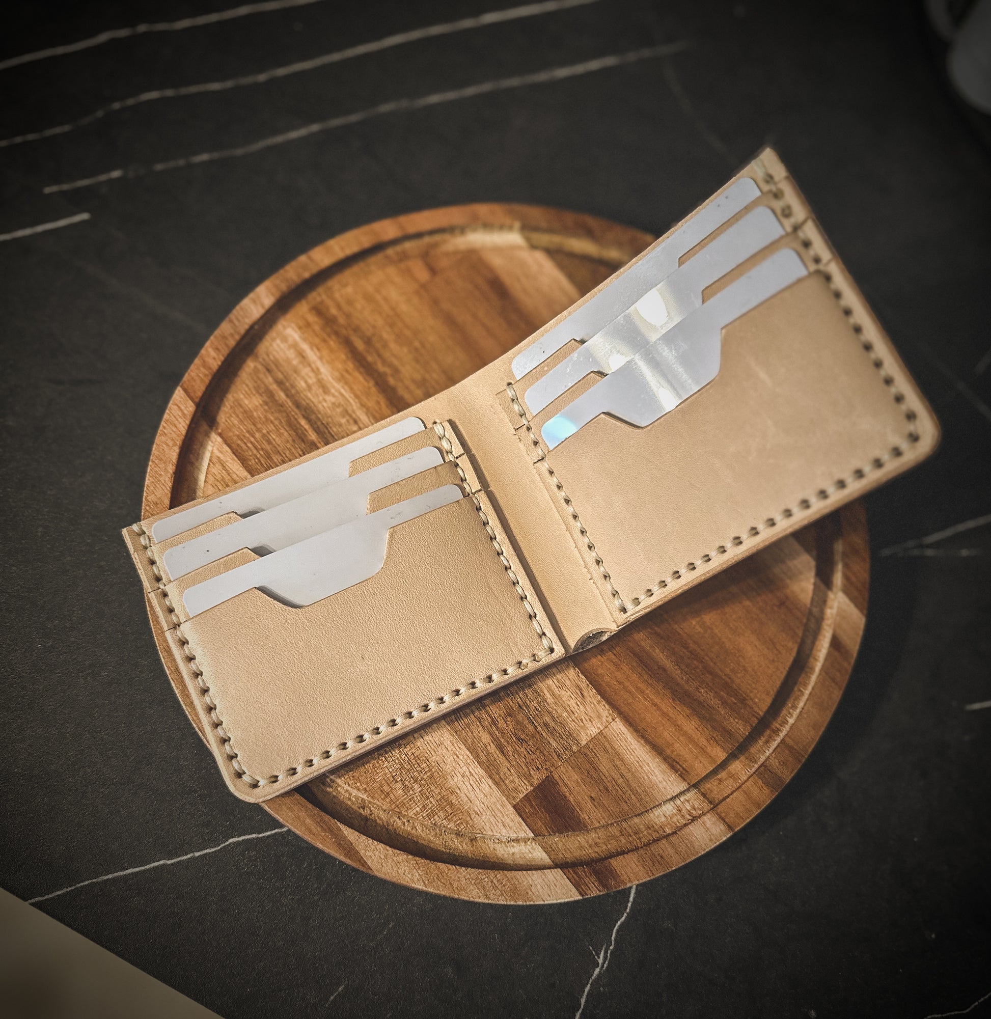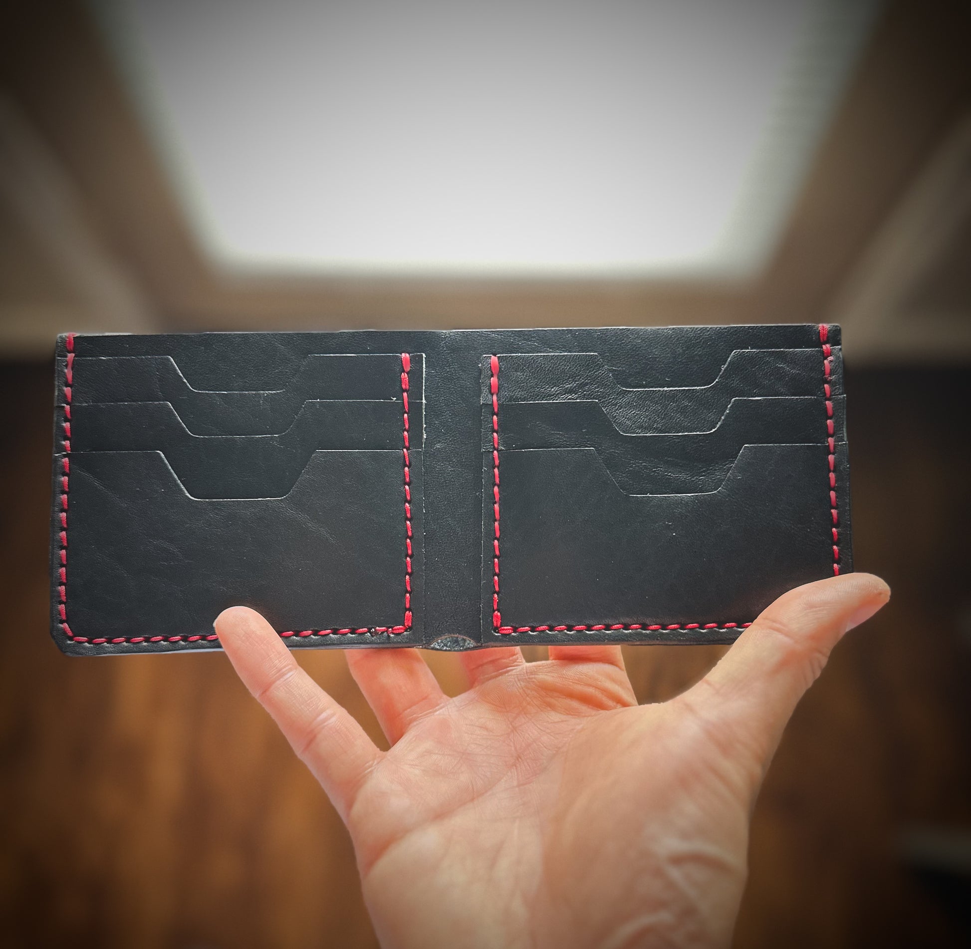 The wallet is made to order and offers 6 total pockets for your cards. The leather has a thickness of 3-4oz. This wallet may hold 6-10 cards depending on break-in.