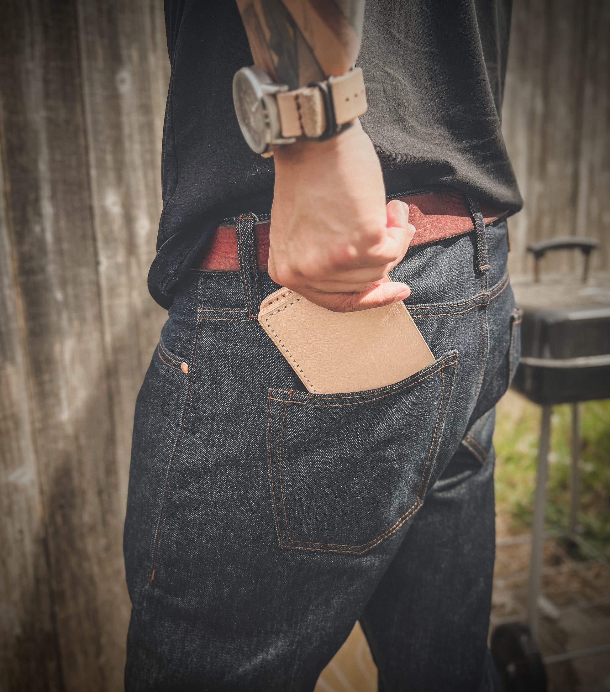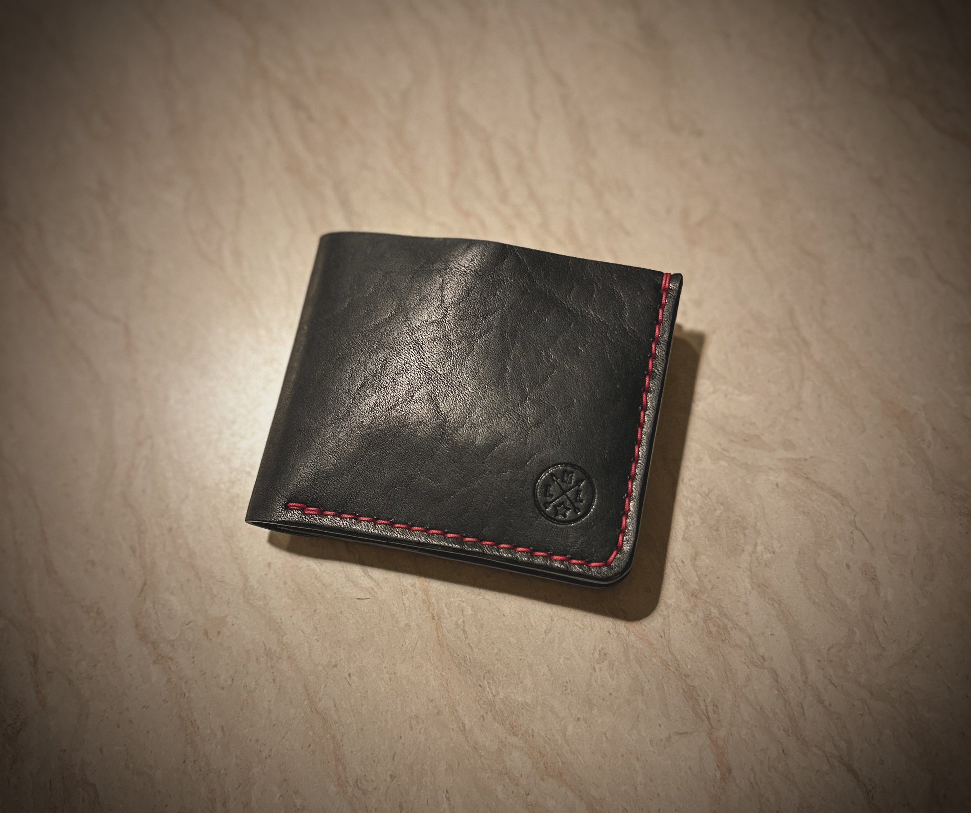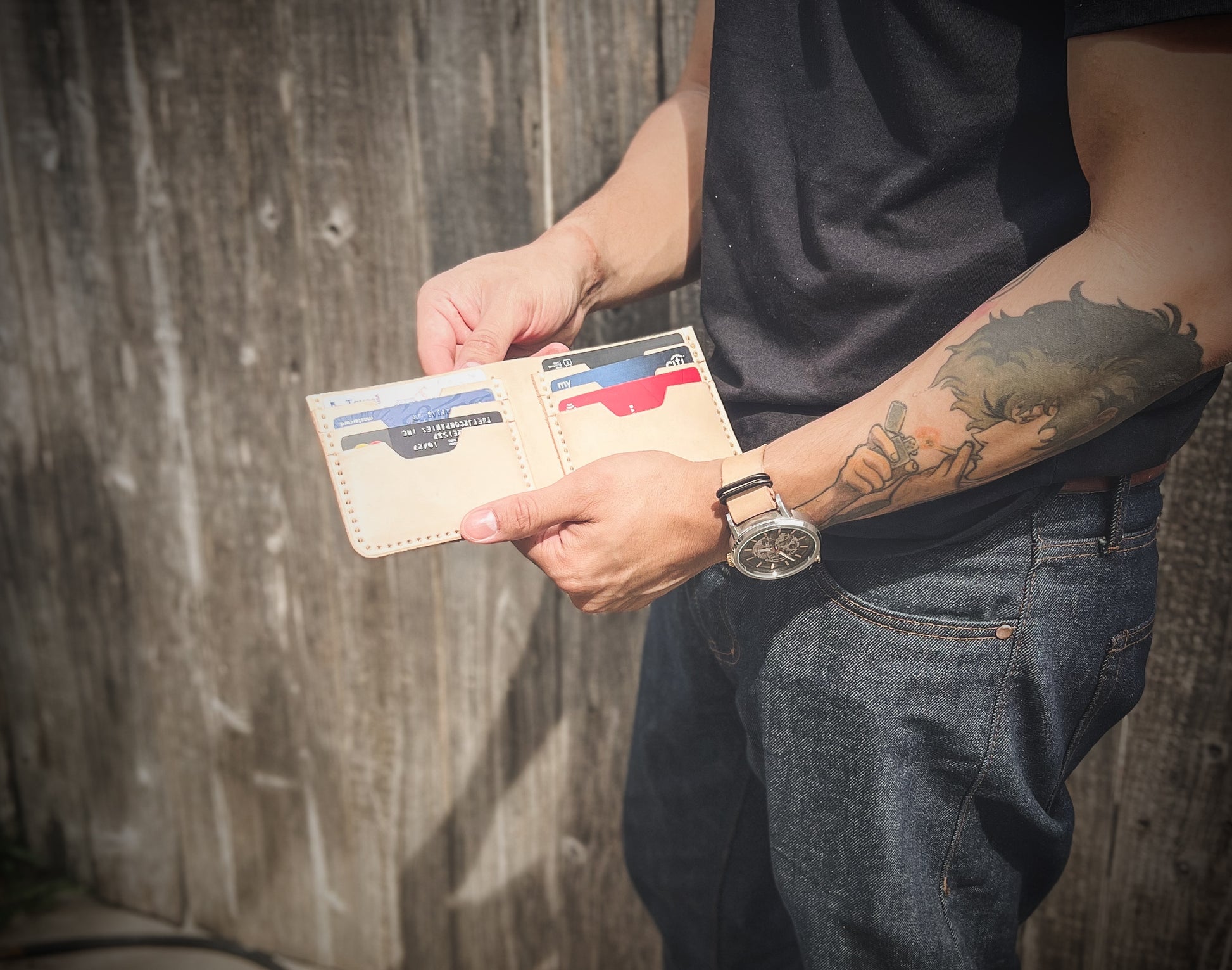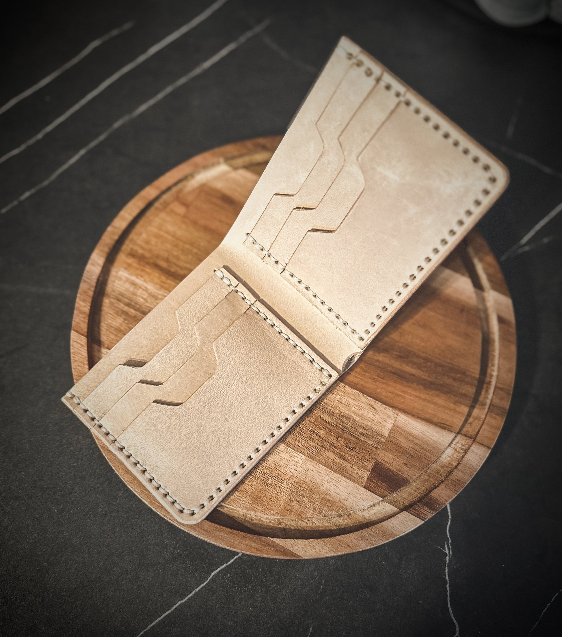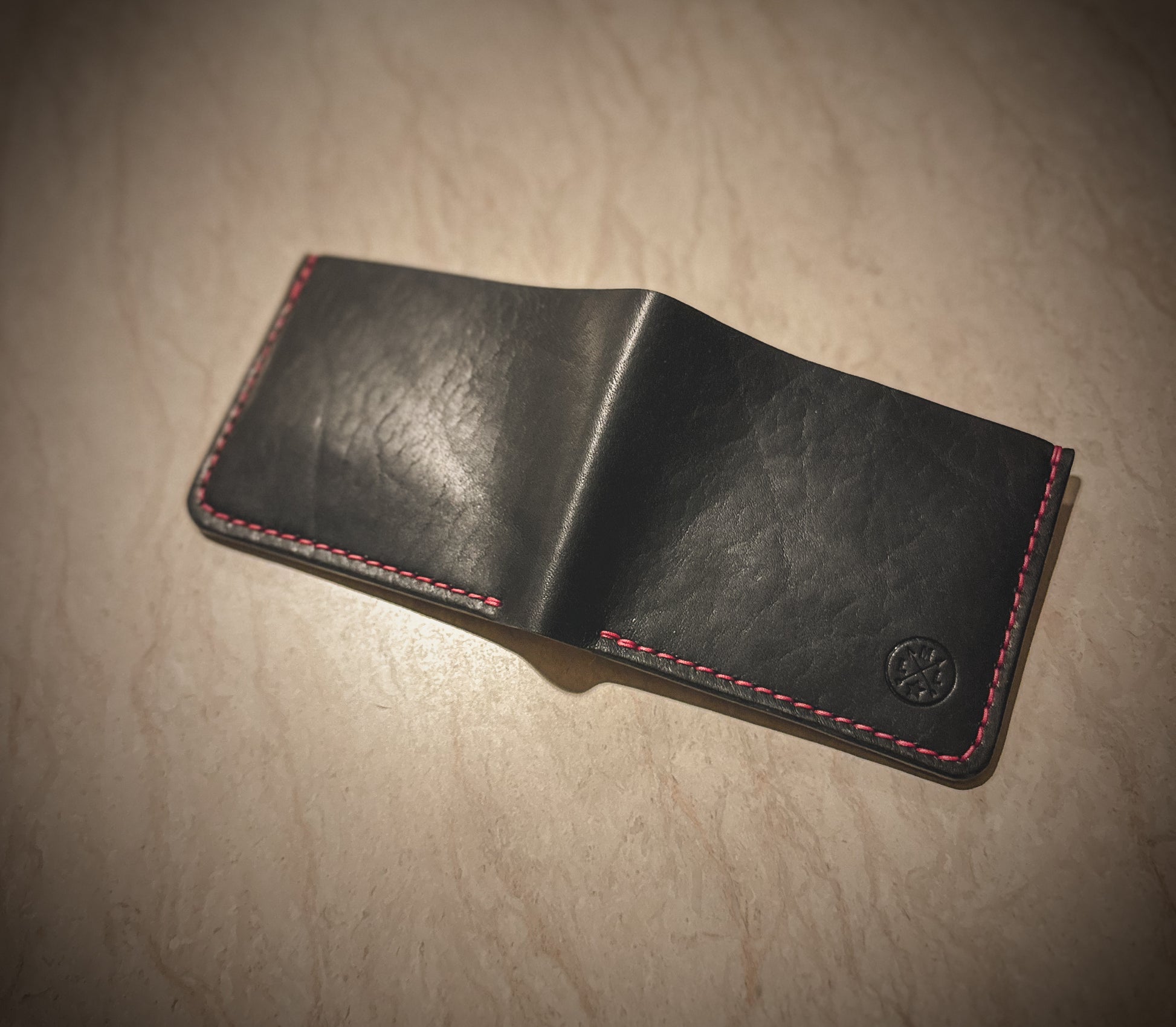 The wallet is made to order and offers 6 total pockets for your cards. The leather has a thickness of 3-4oz. This wallet may hold 6-10 cards depending on break-in.