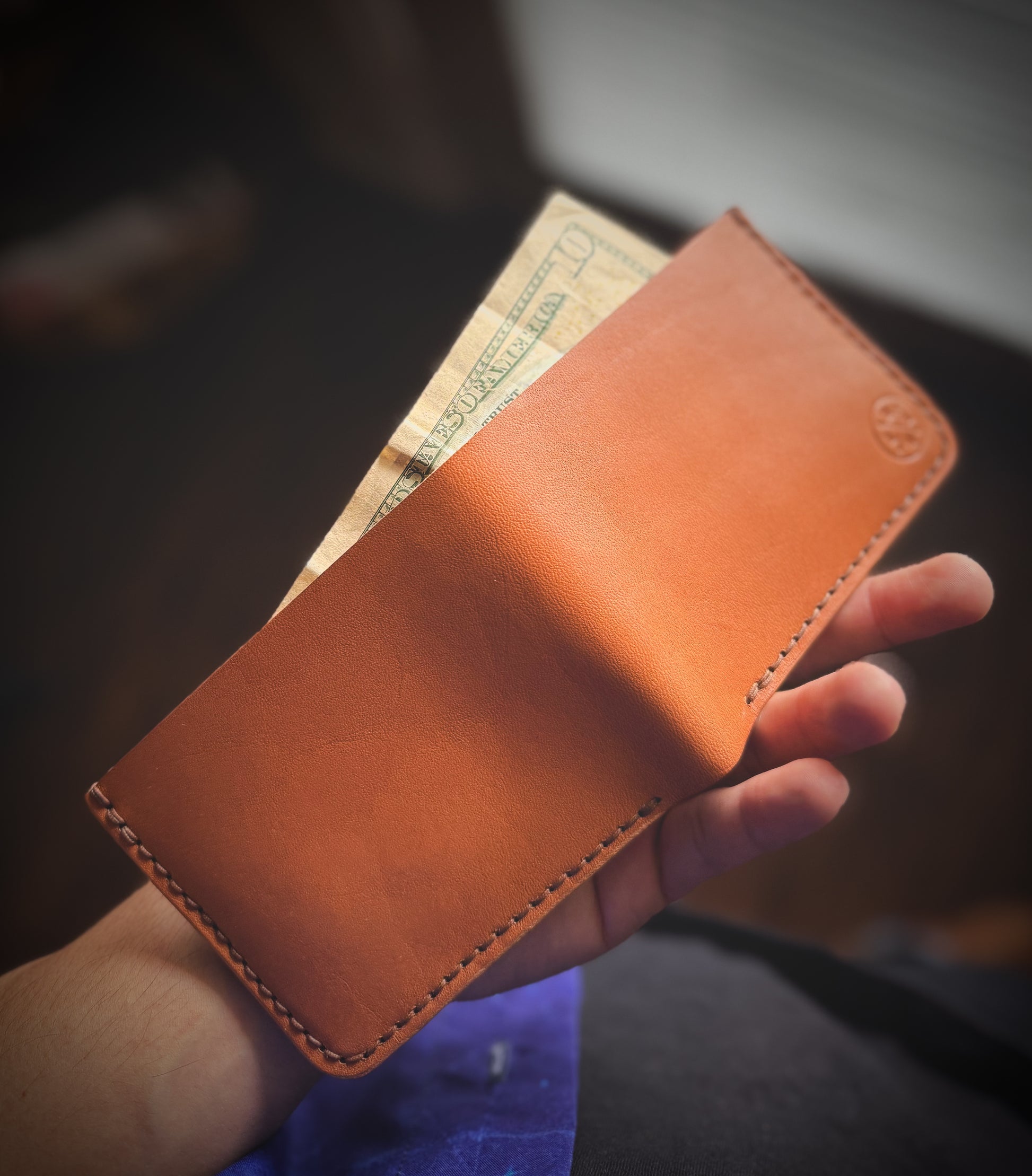 The wallet is ready to ship and offers 6 total pockets for your cards. The leather has a thickness of 3-4oz. This wallet may hold 6-10 cards depending on break-in.