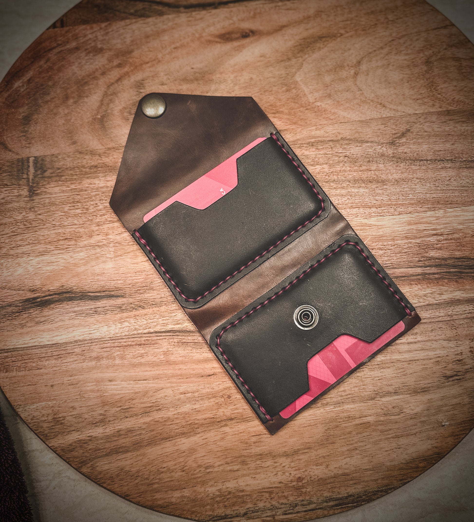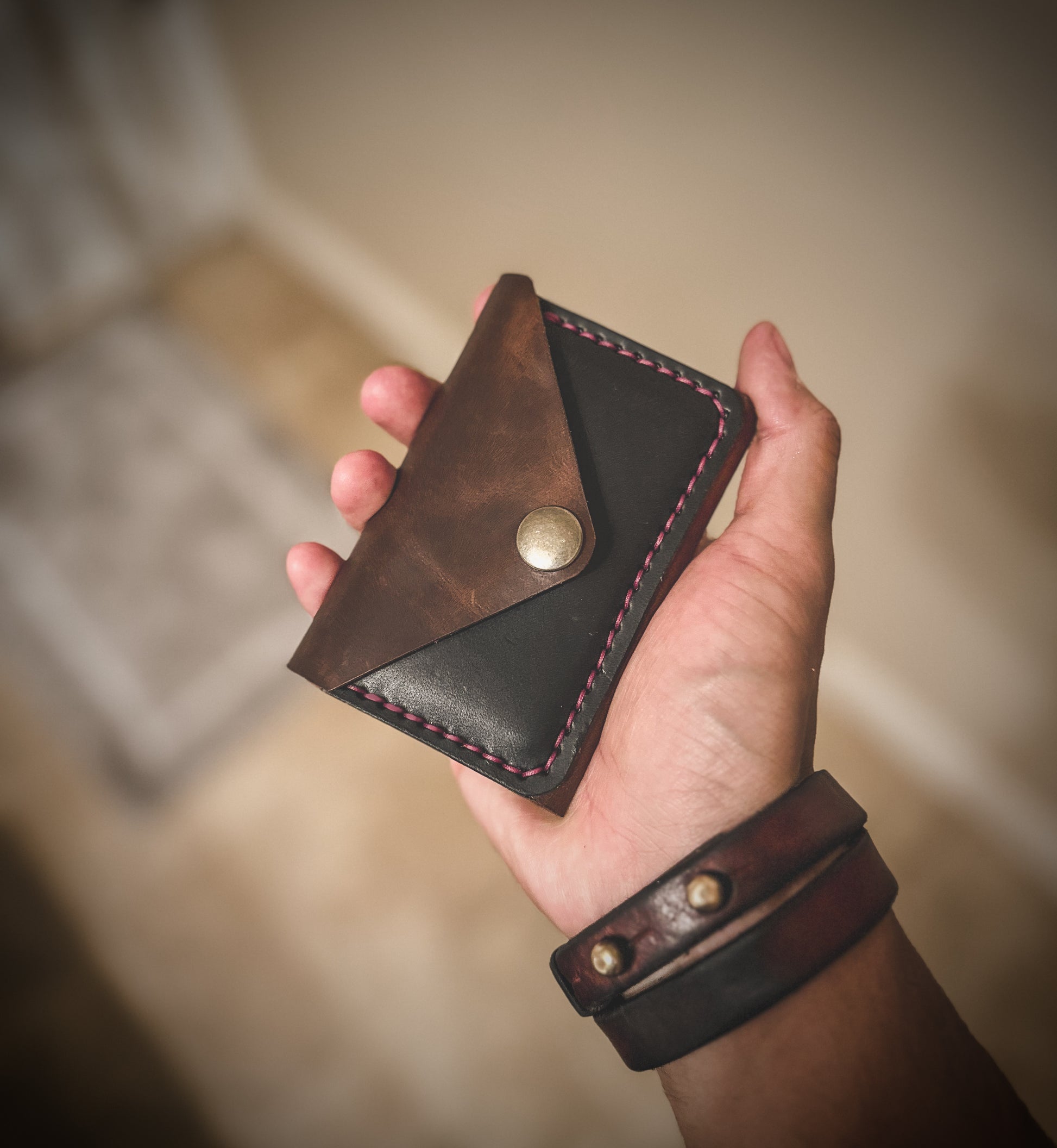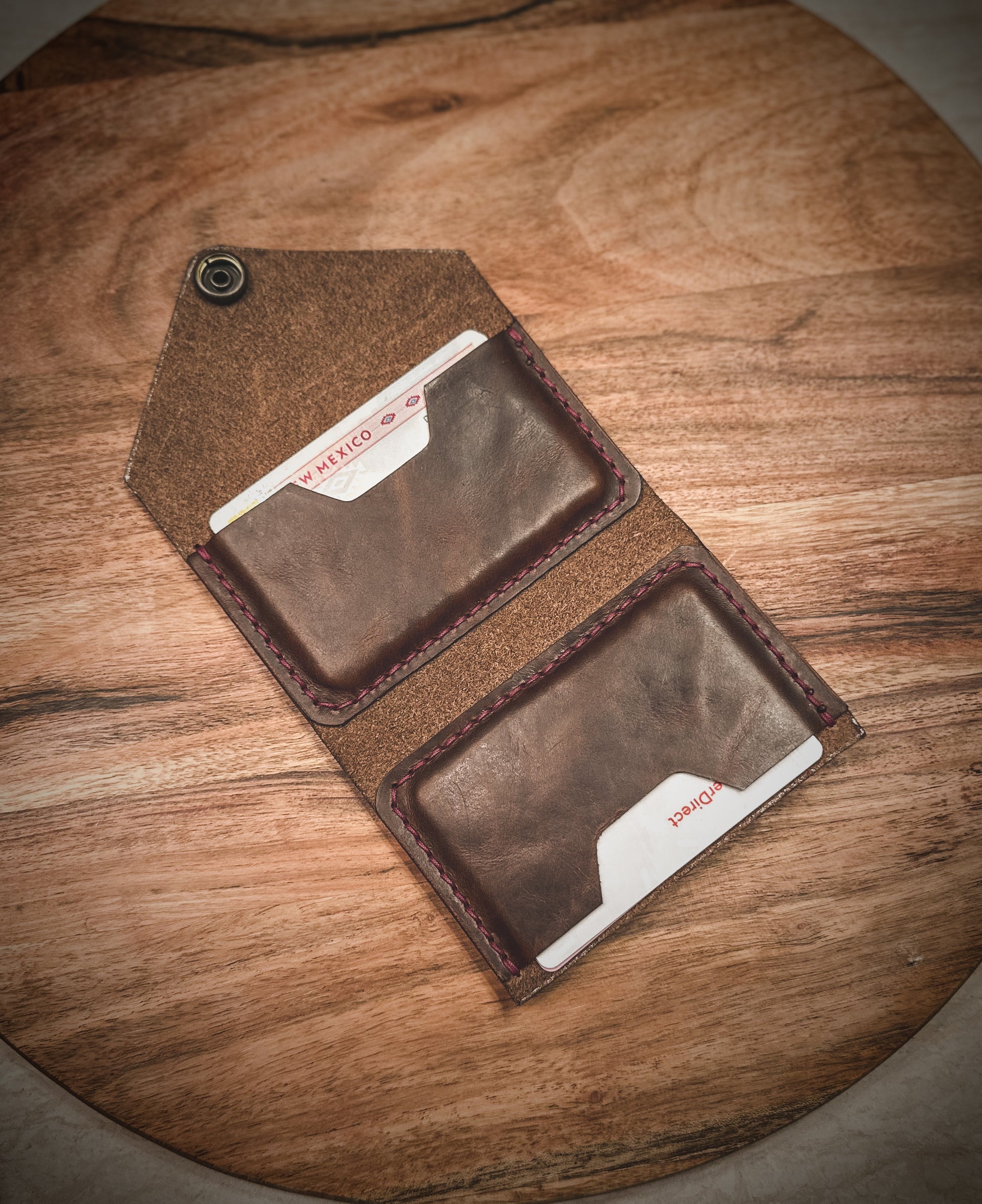 The wallet is made to order and offers 4 total pockets for your cards. The leather has a thickness of 3-4oz. This item is meant for those who usually carry cards. All my items are hand made to order.