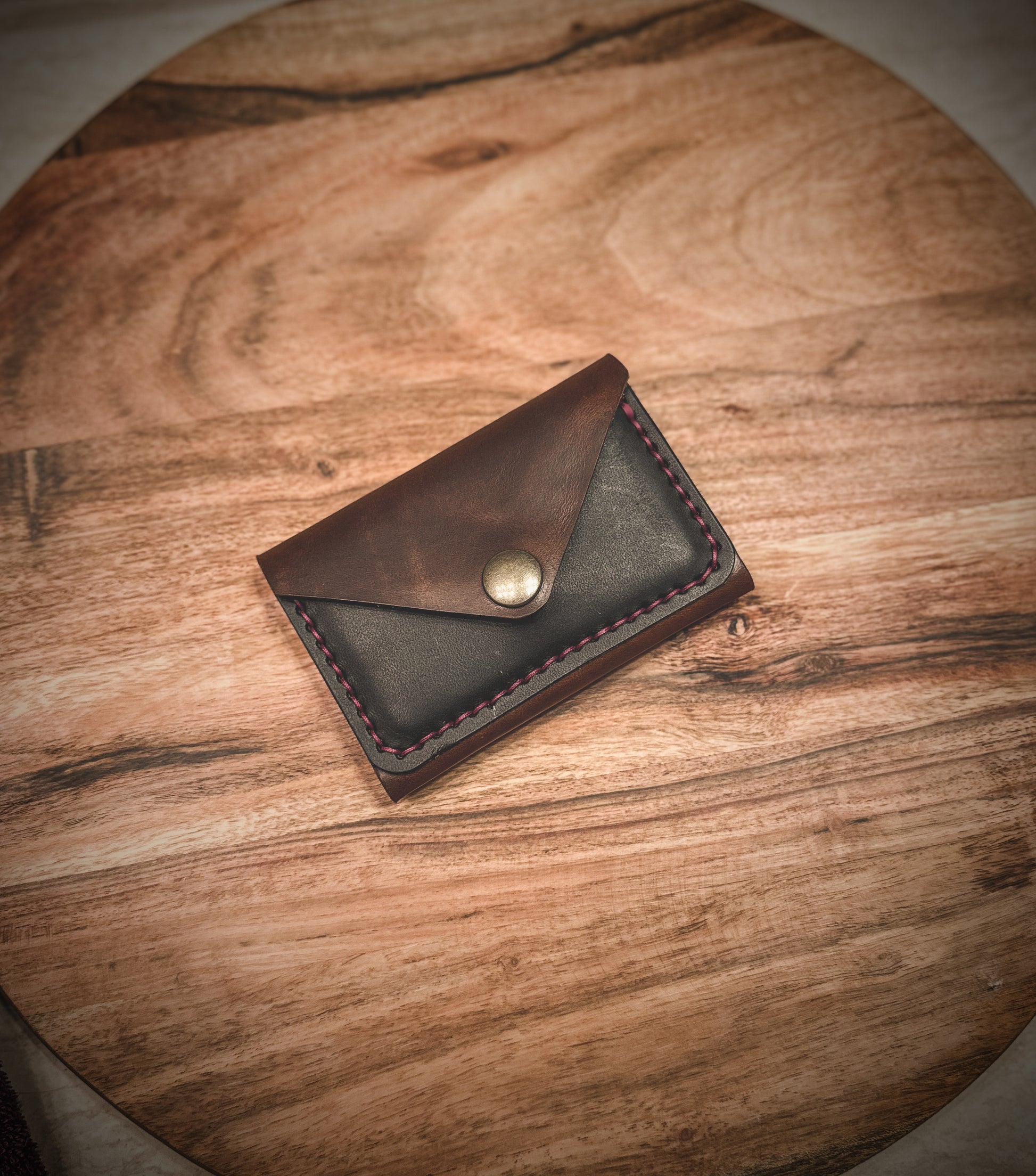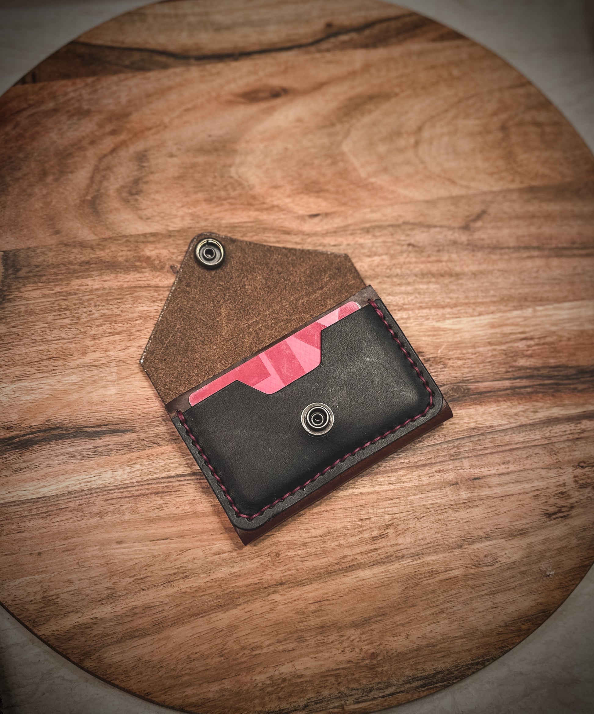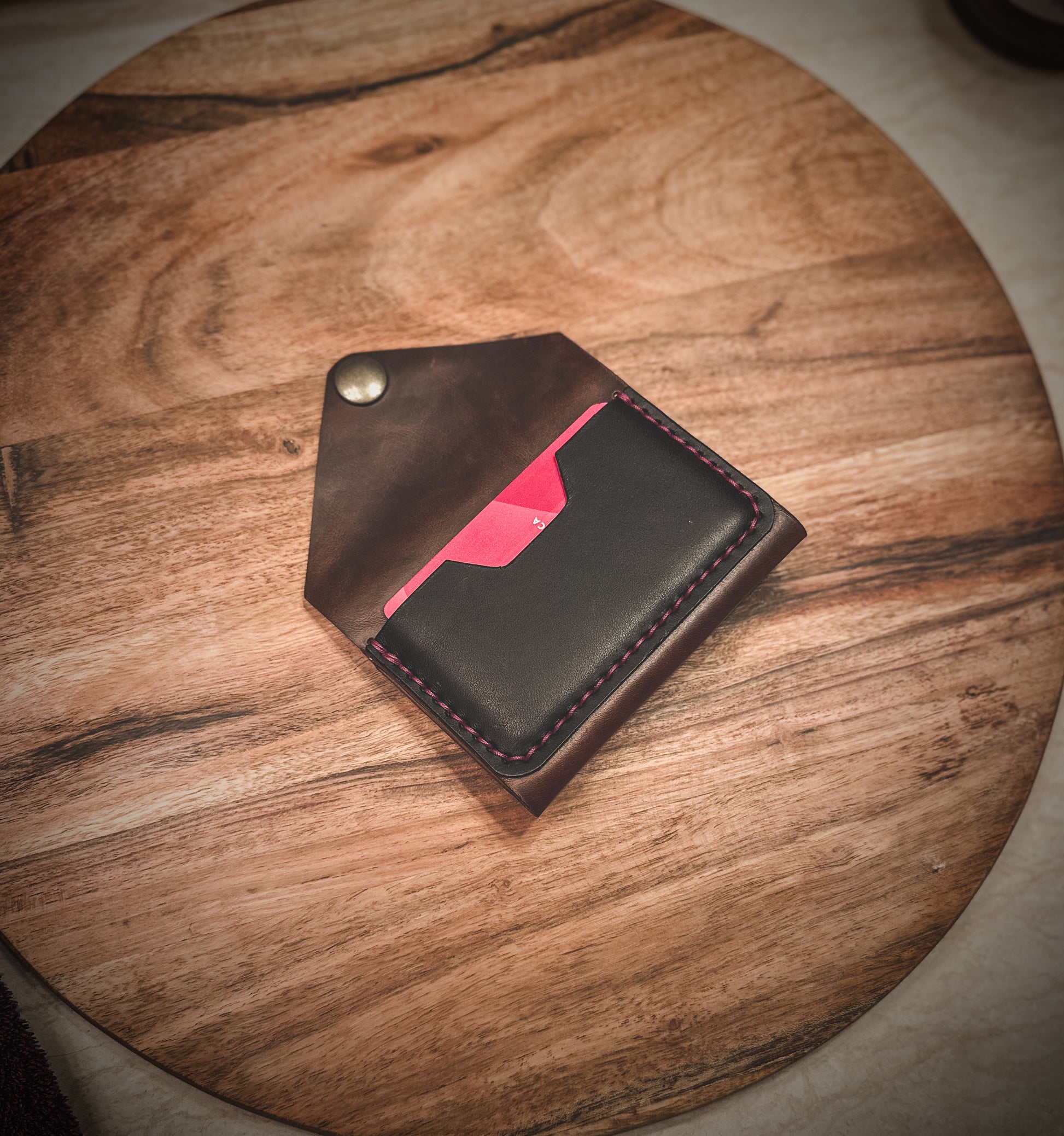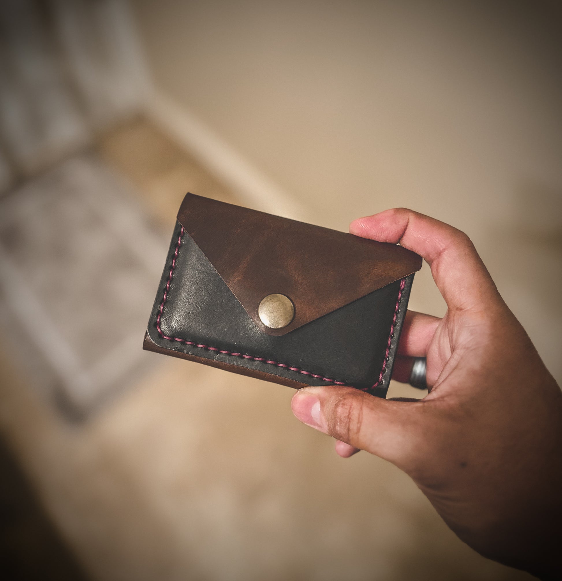 The wallet is made to order and offers 4 total pockets for your cards. The leather has a thickness of 3-4oz. This item is meant for those who usually carry cards. All my items are hand made to order.