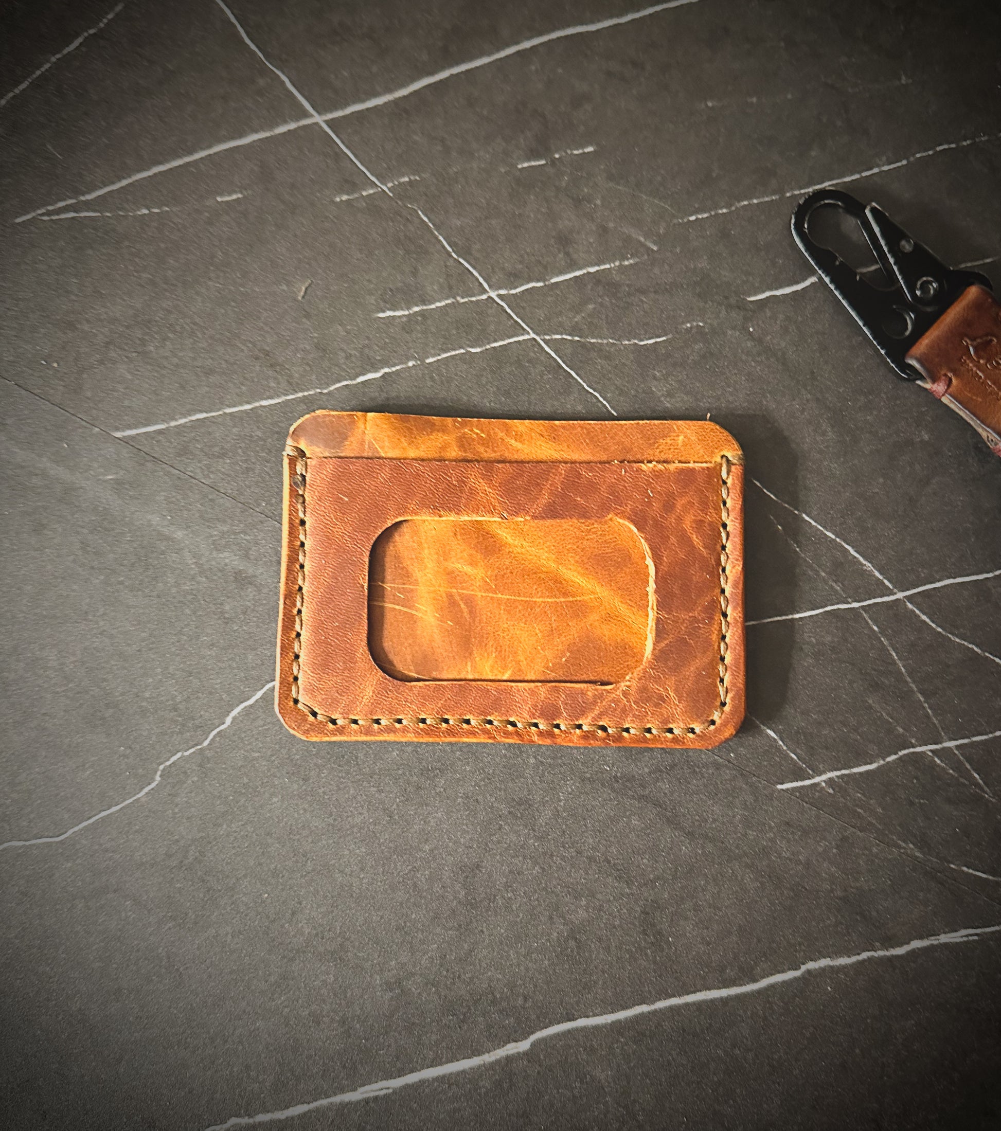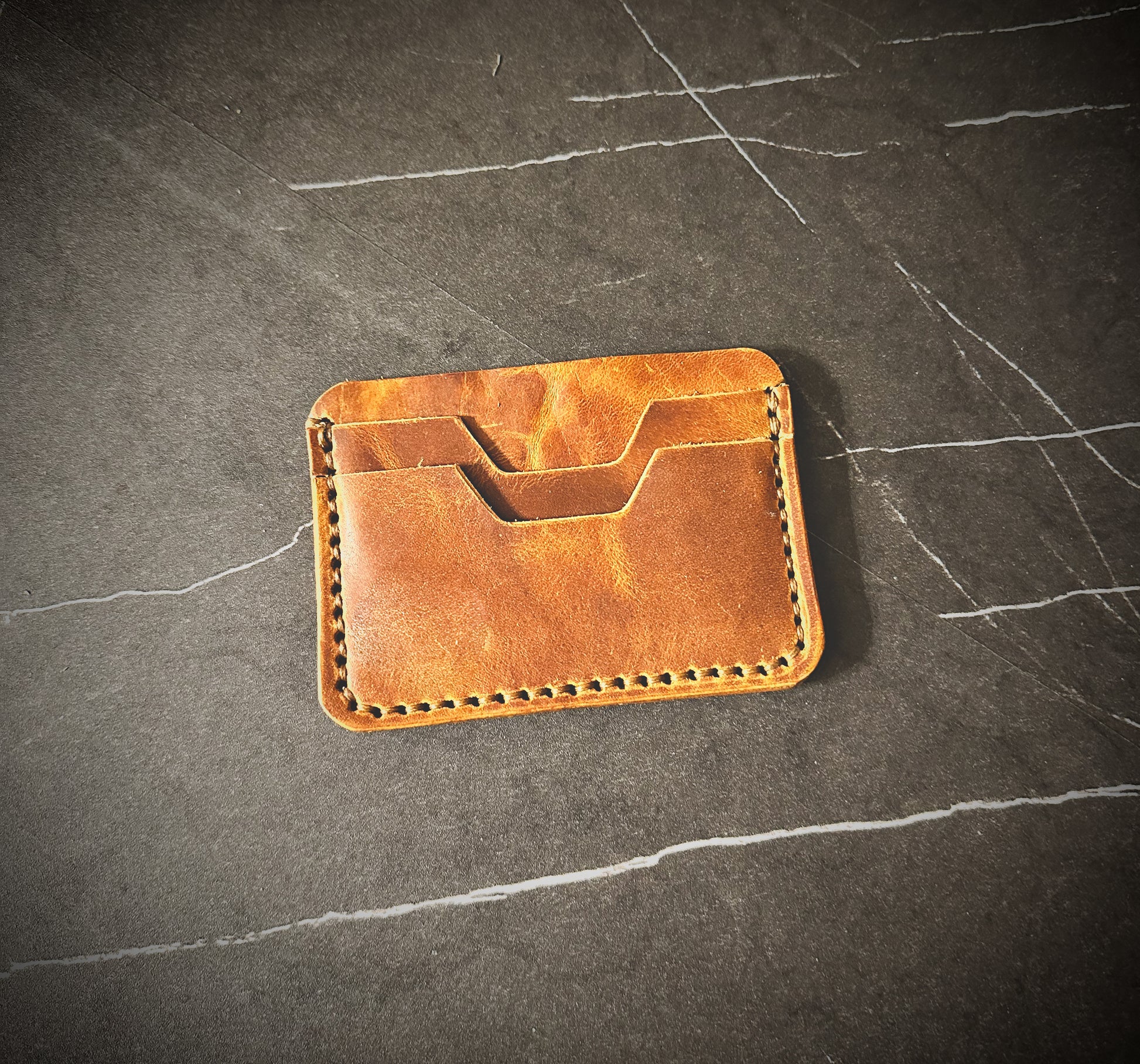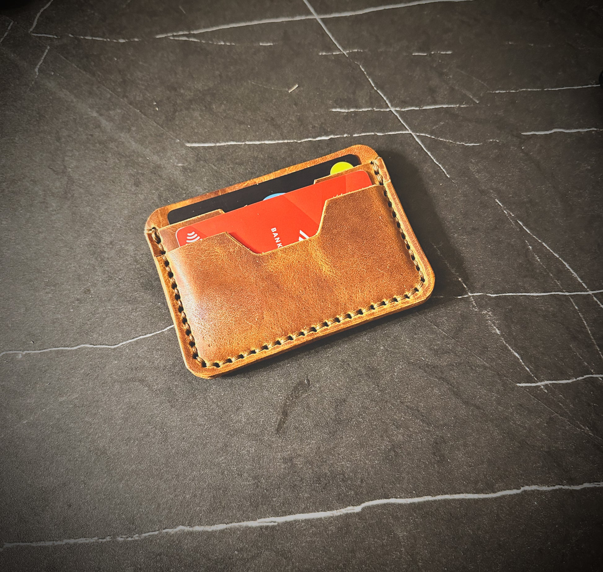 The wallet is made to order and offers 4 total pockets for your cards including an ID Slot. The leather has a thickness of 3-4oz. I hand dye veg tans or you can opt to keep it natural veg tan. I also offer premium leather options in various colors. (Additional cost)