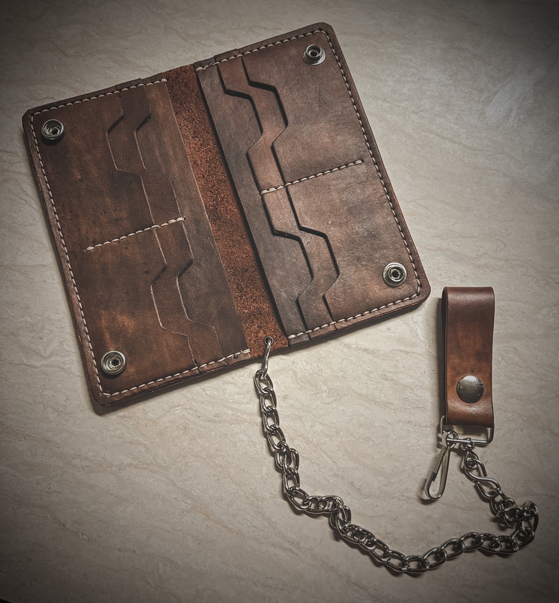 The wallet is full grain 3-4oz leather that can hold 16 cards and has two bill slots. Please provide information on order notes at checkout if you would like an eyelet punched in on the wallet for chain attachment.