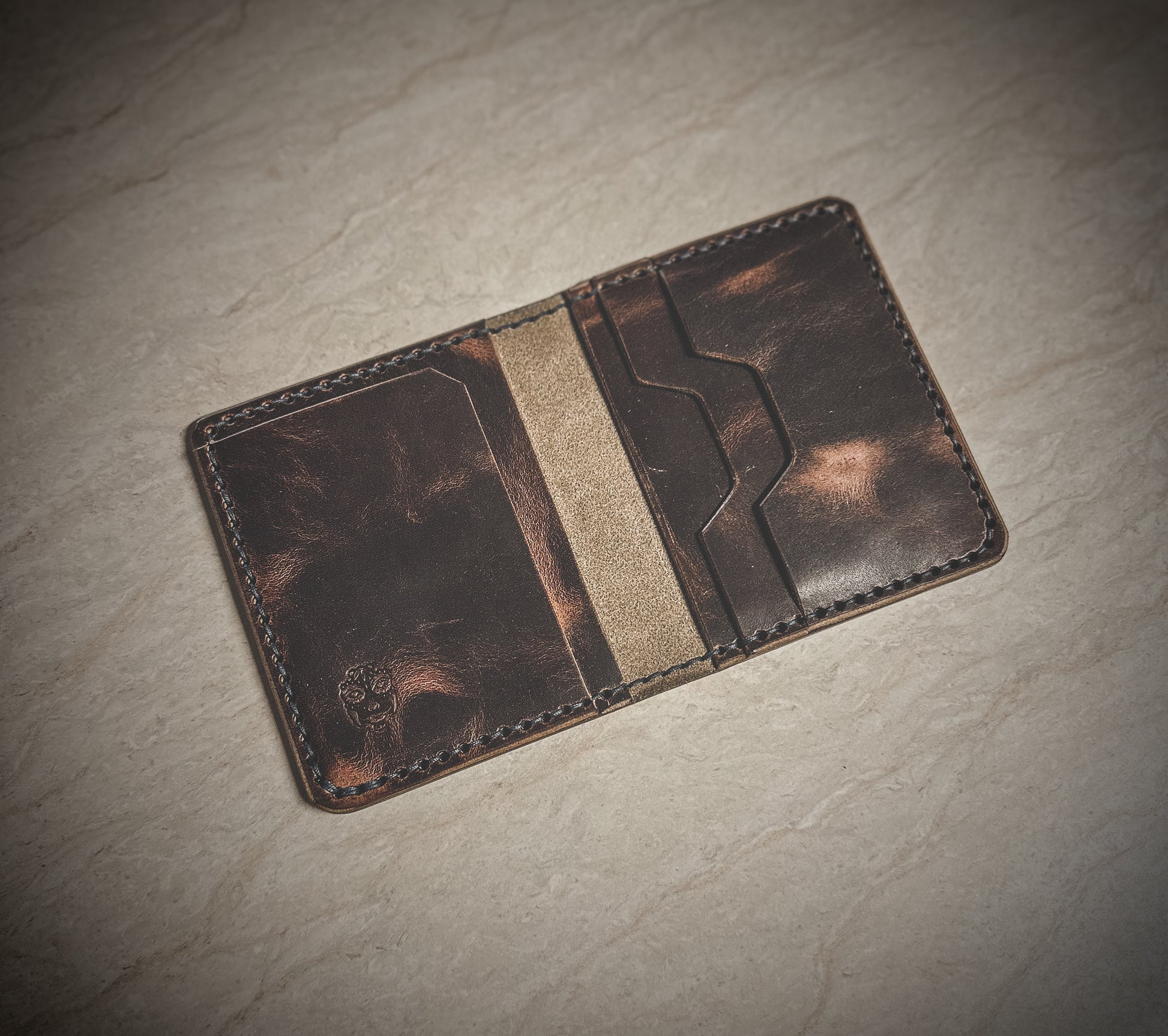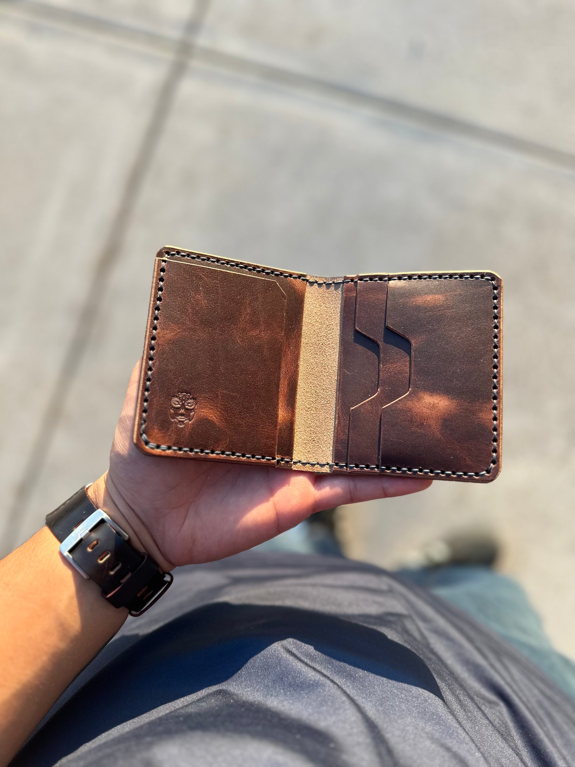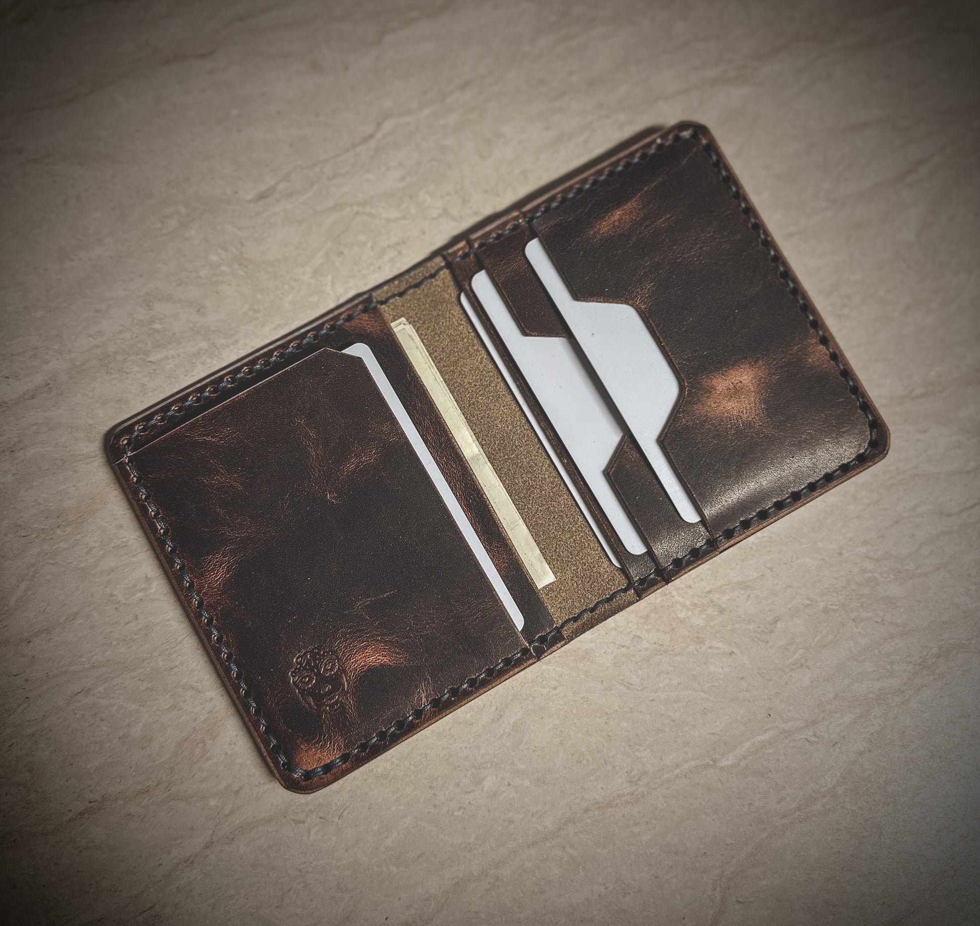 The wallet is made to order and offers 5 total pockets for your cards. The leather has a thickness of 3-4oz.