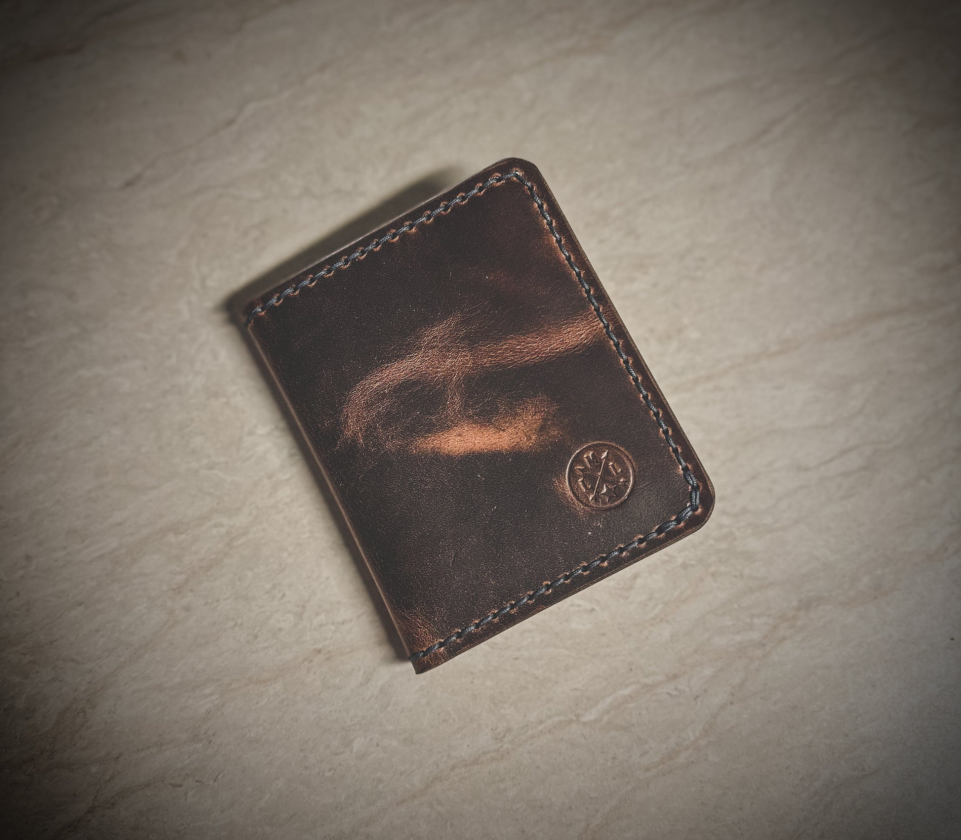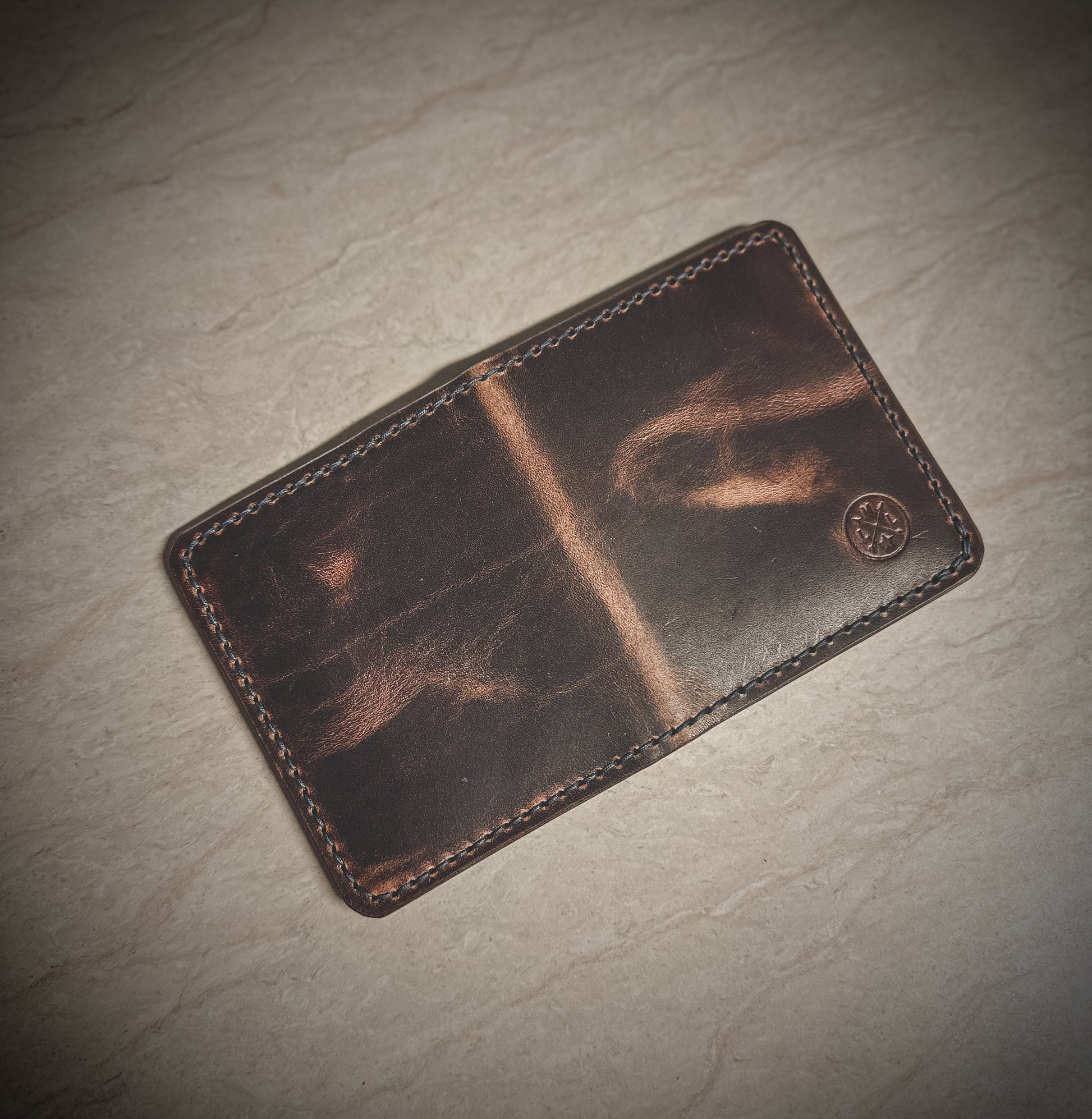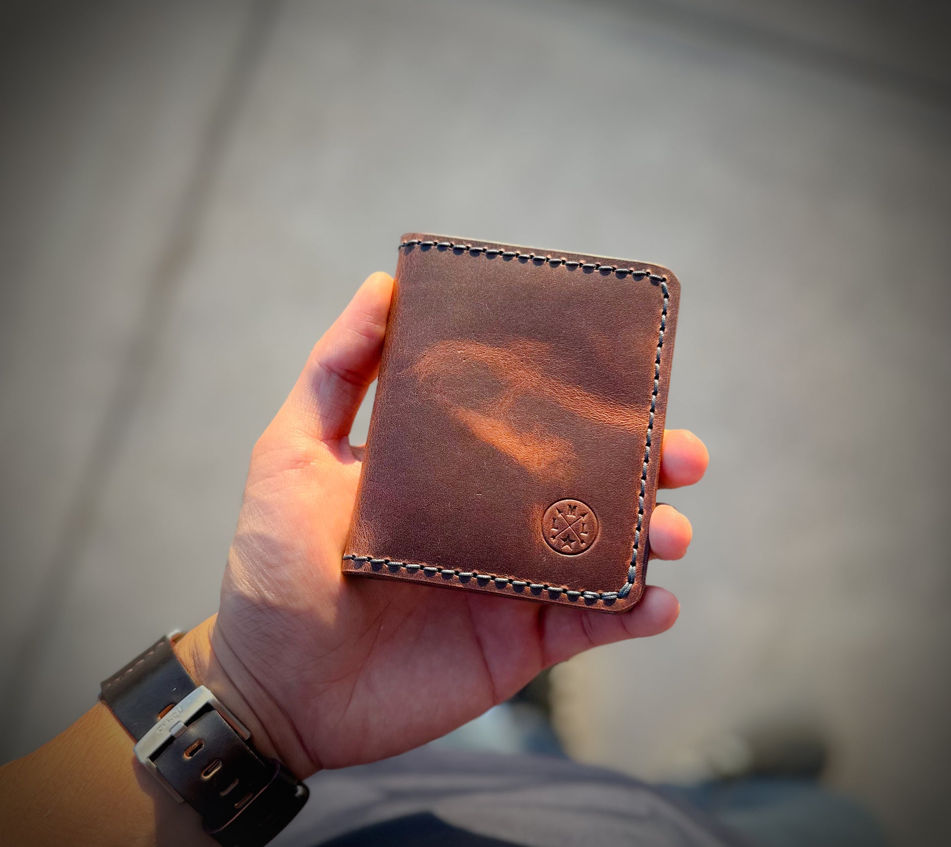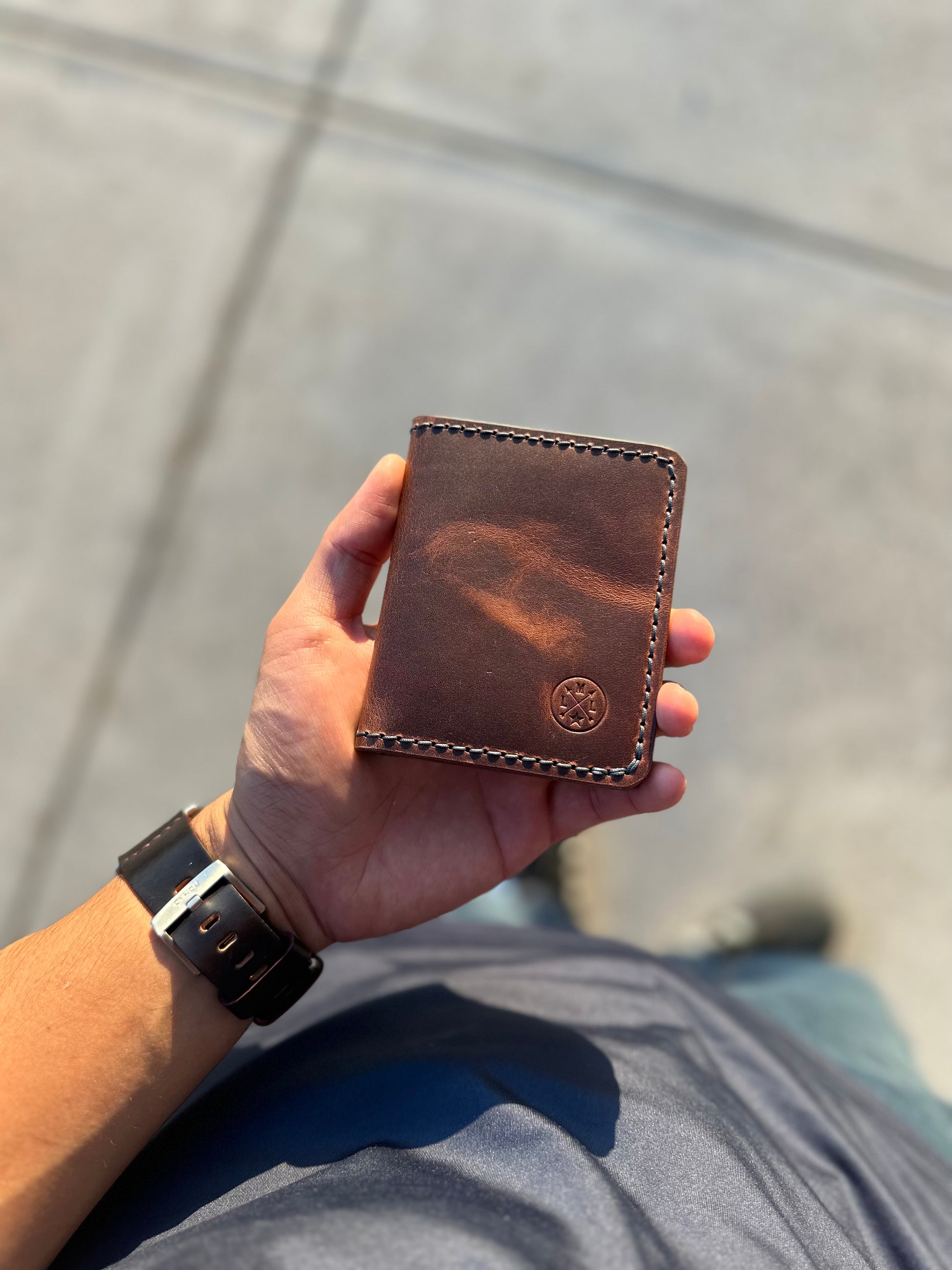 The wallet is made to order and offers 5 total pockets for your cards. The leather has a thickness of 3-4oz.