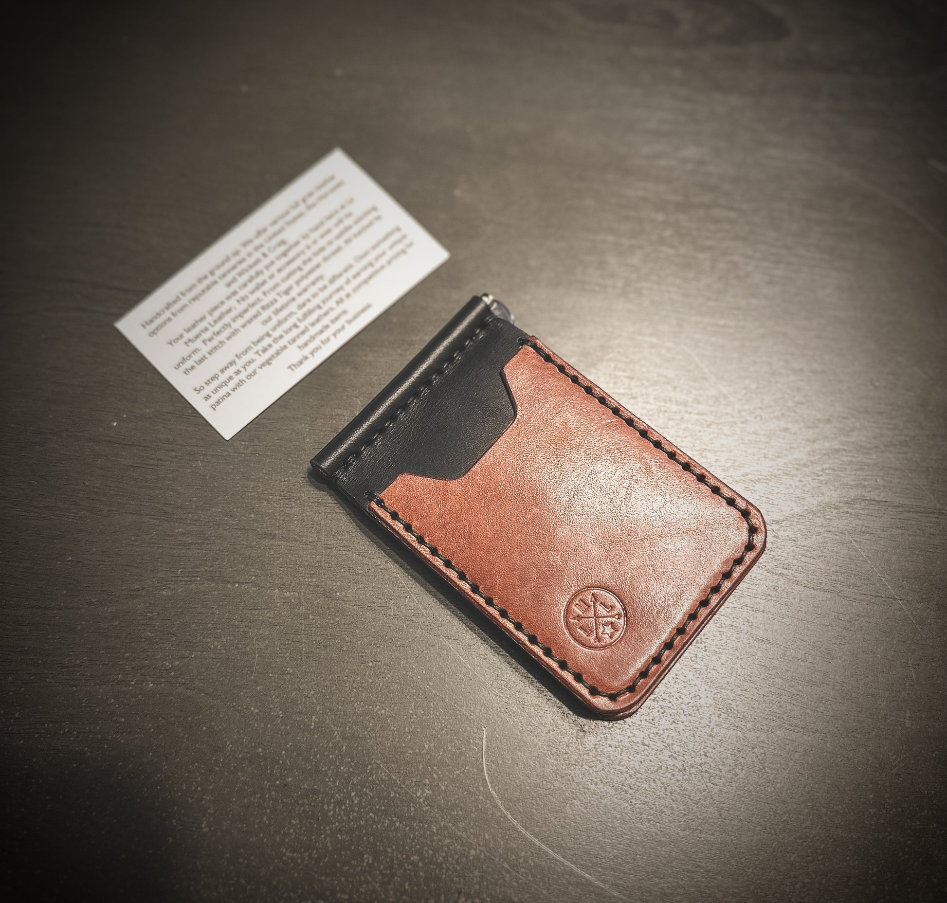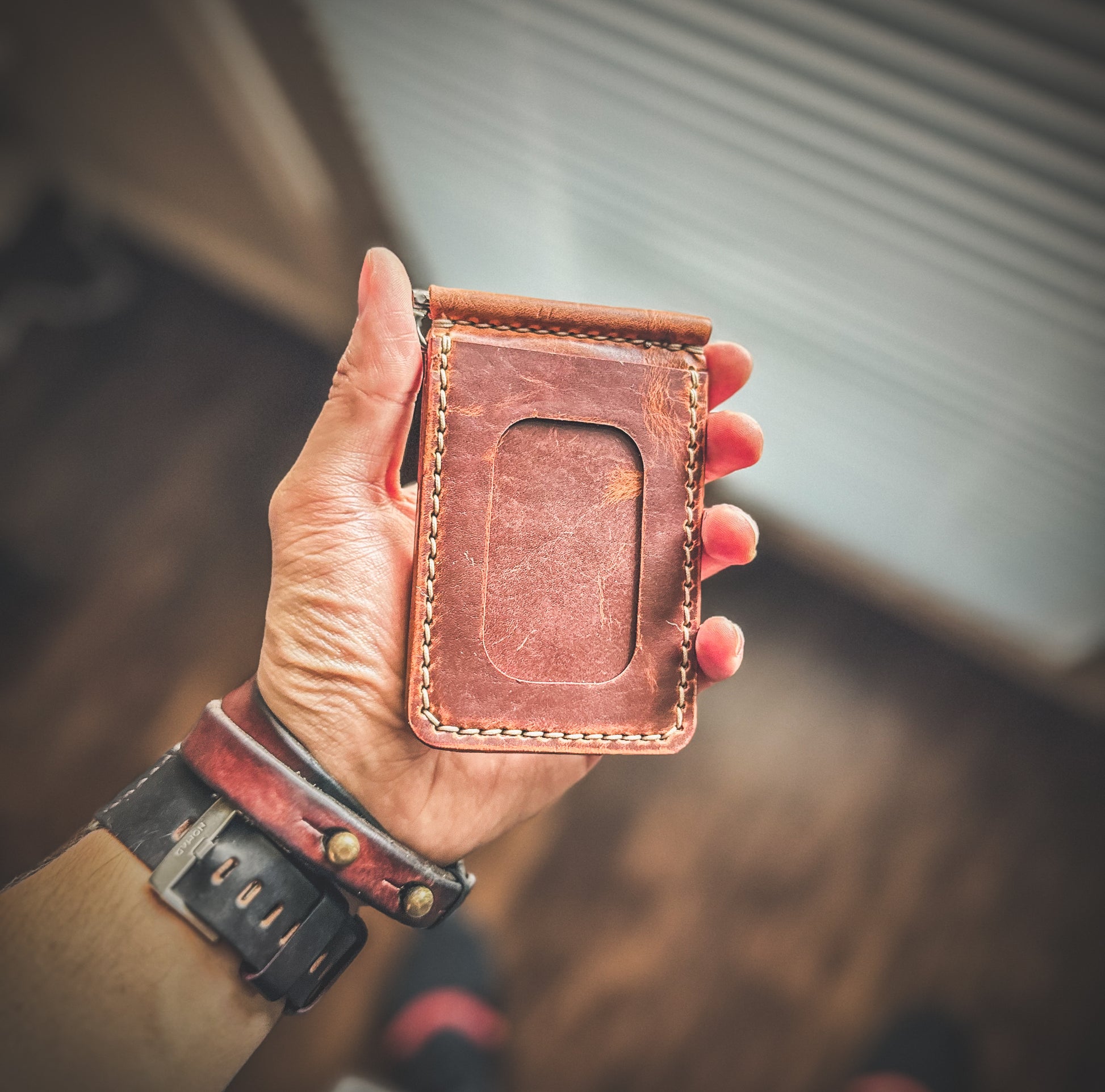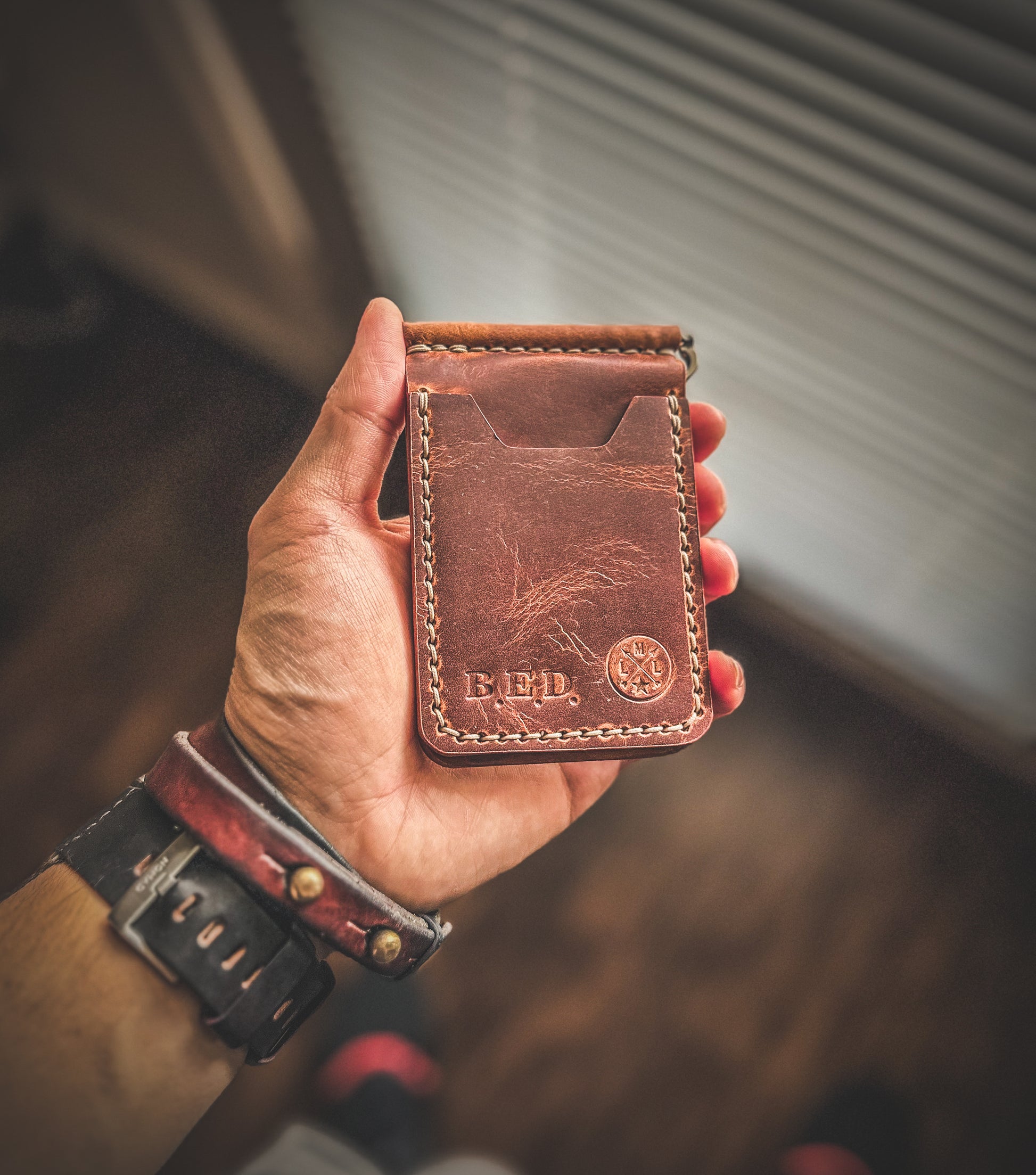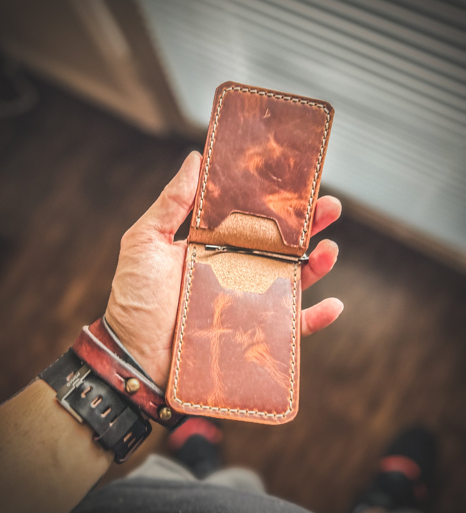 Full grain vegetable tanned leather bi-fold wallet containing 3 card slots, a ID slot and a money clip for bills.