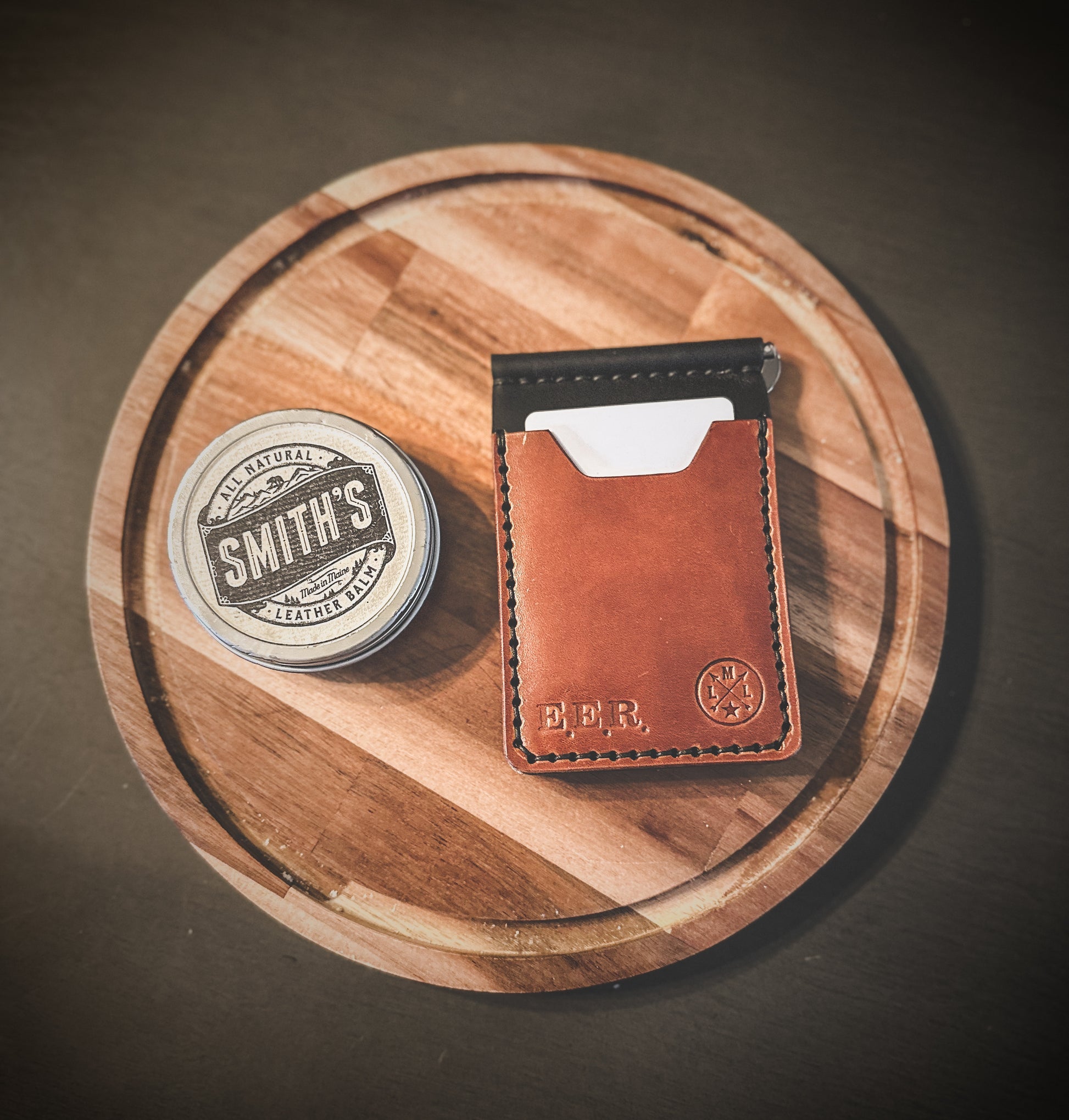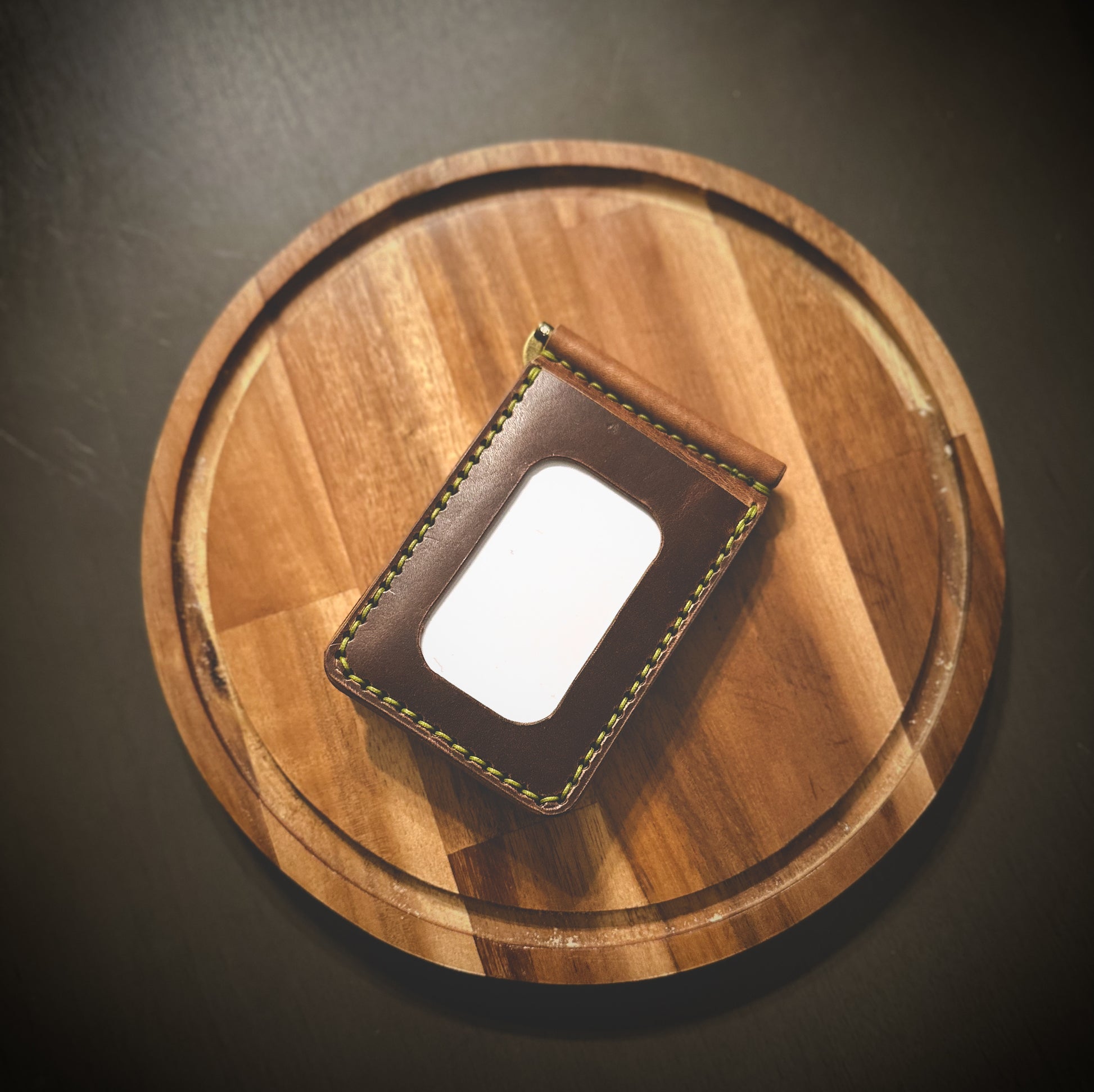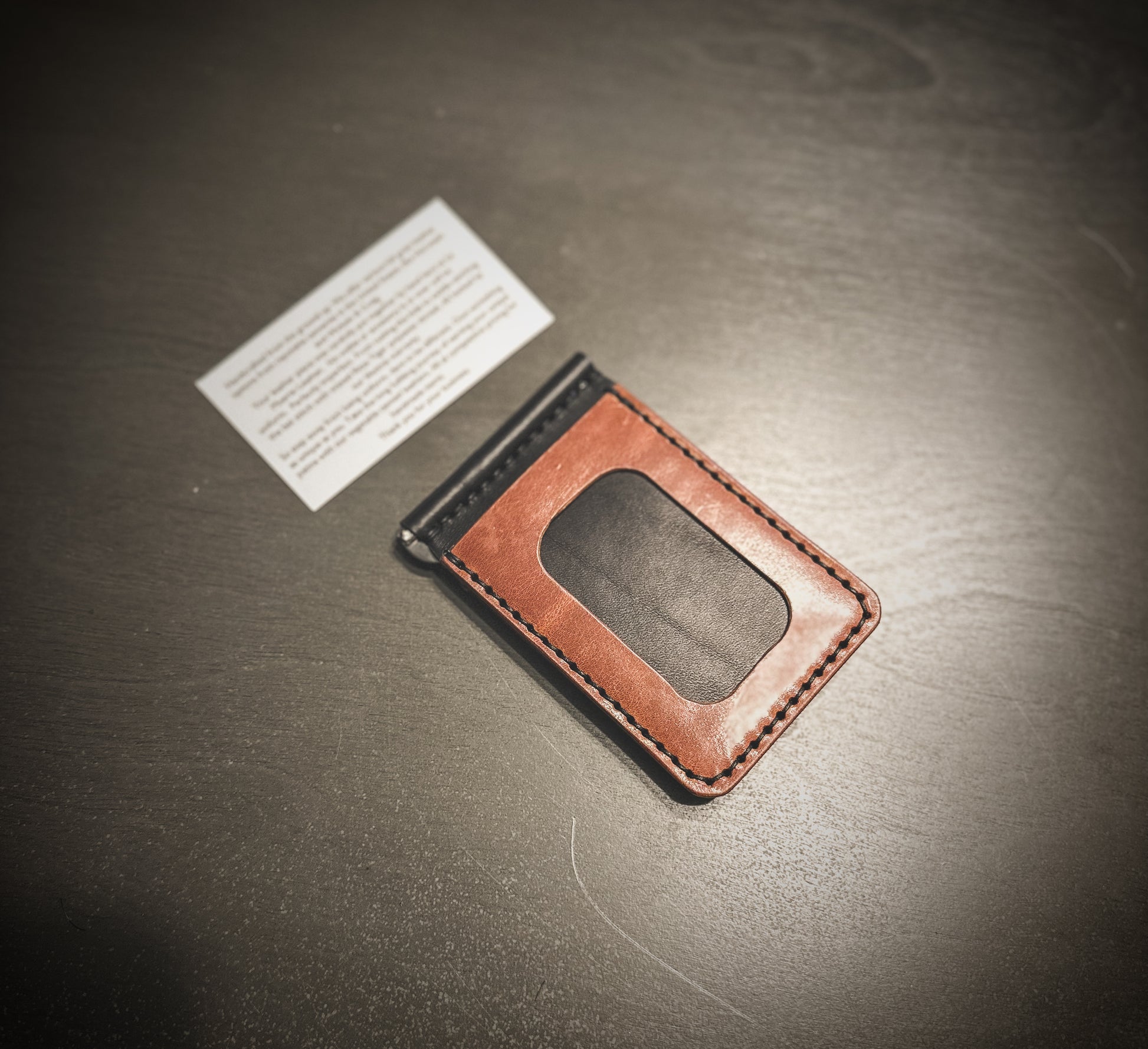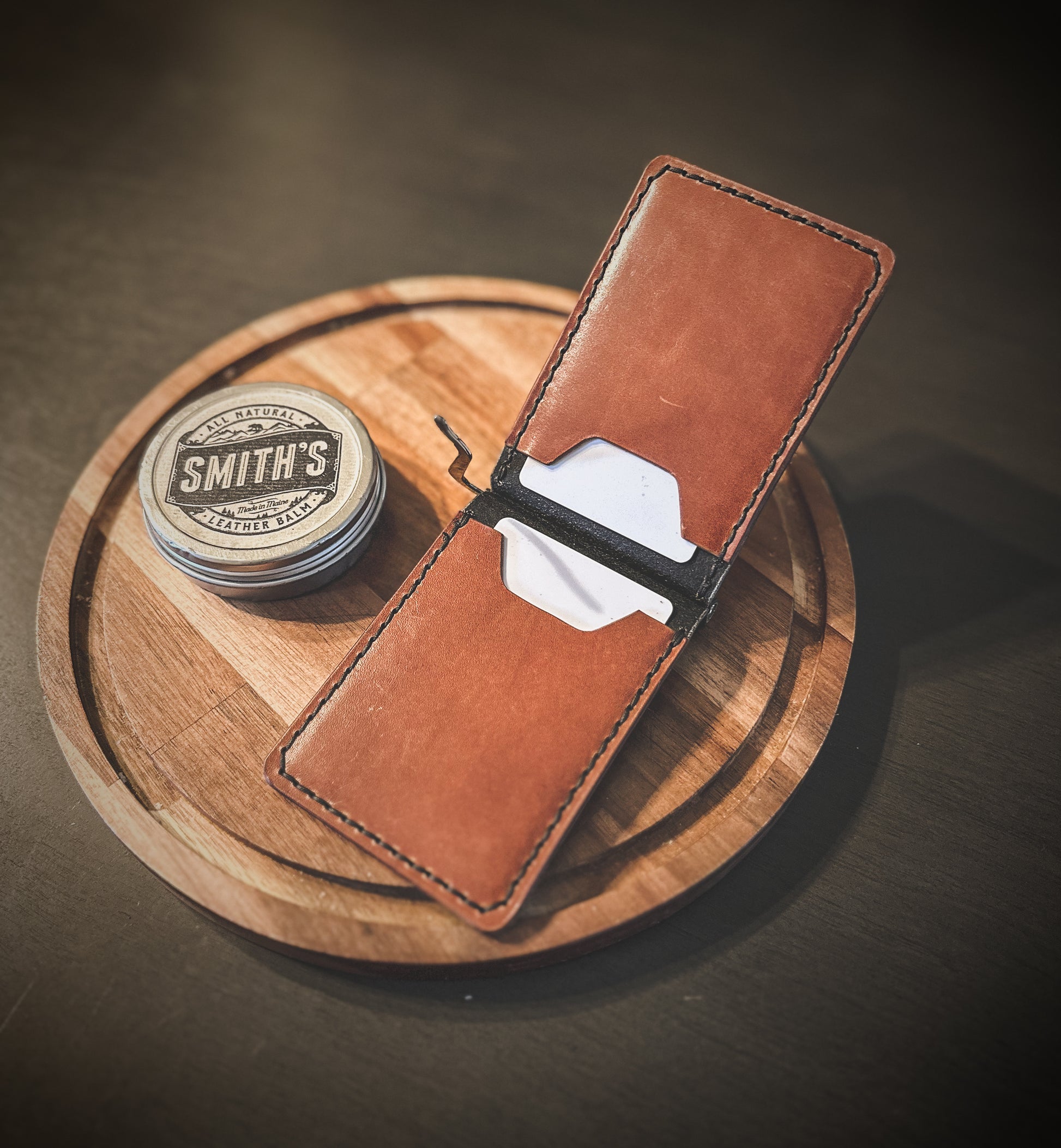 Full grain vegetable tanned leather bi-fold wallet containing 3 card slots, a ID slot and a money clip for bills.