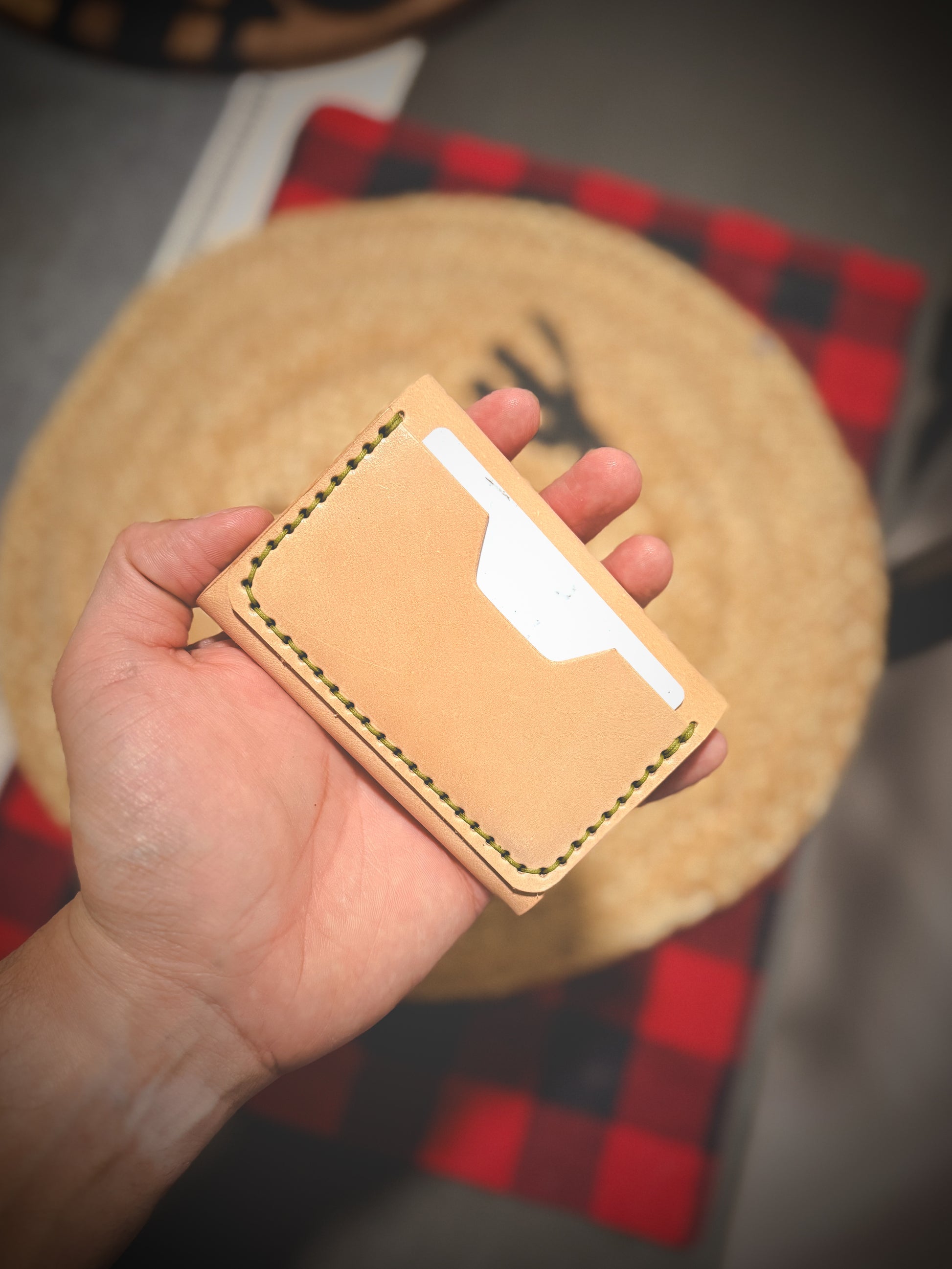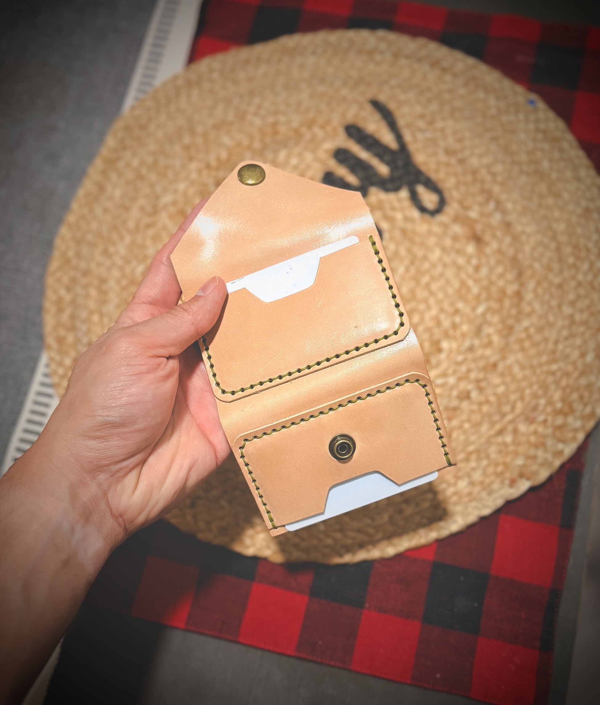 The wallet is made to order and offers 4 total pockets for your cards. The leather has a thickness of 3-4oz. This item is meant for those who usually carry cards. Hardware snap will be antique colored brass.