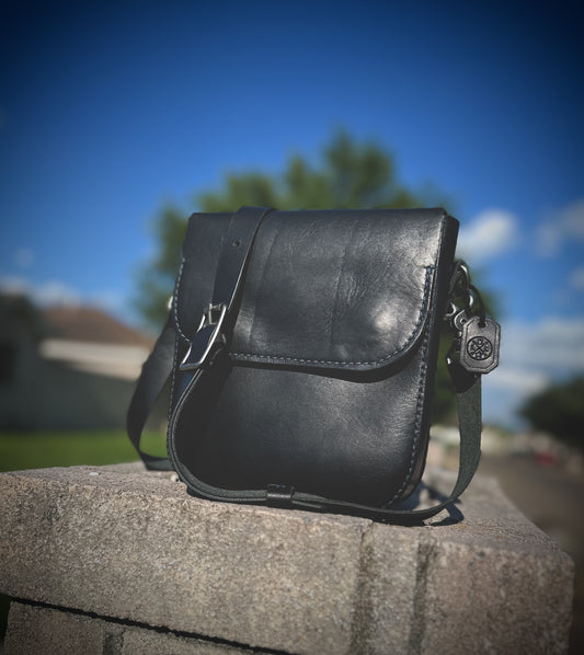Black with Blue Thread ‘Maverick’ Full Grain Leather Crossbody Bag
