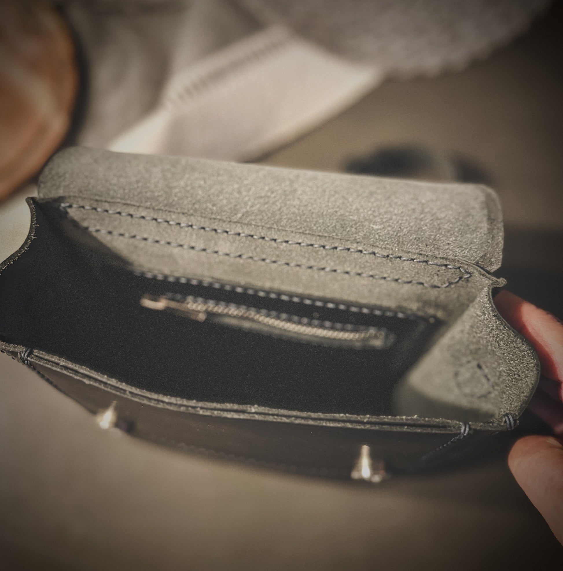 This purse is Ready to ship and features a zipper pocket on the inside of the crossbody and a slit pocket near the front of the purse. The purse is adjustable. The purse can close shut with two magnetic snaps on the flaps.