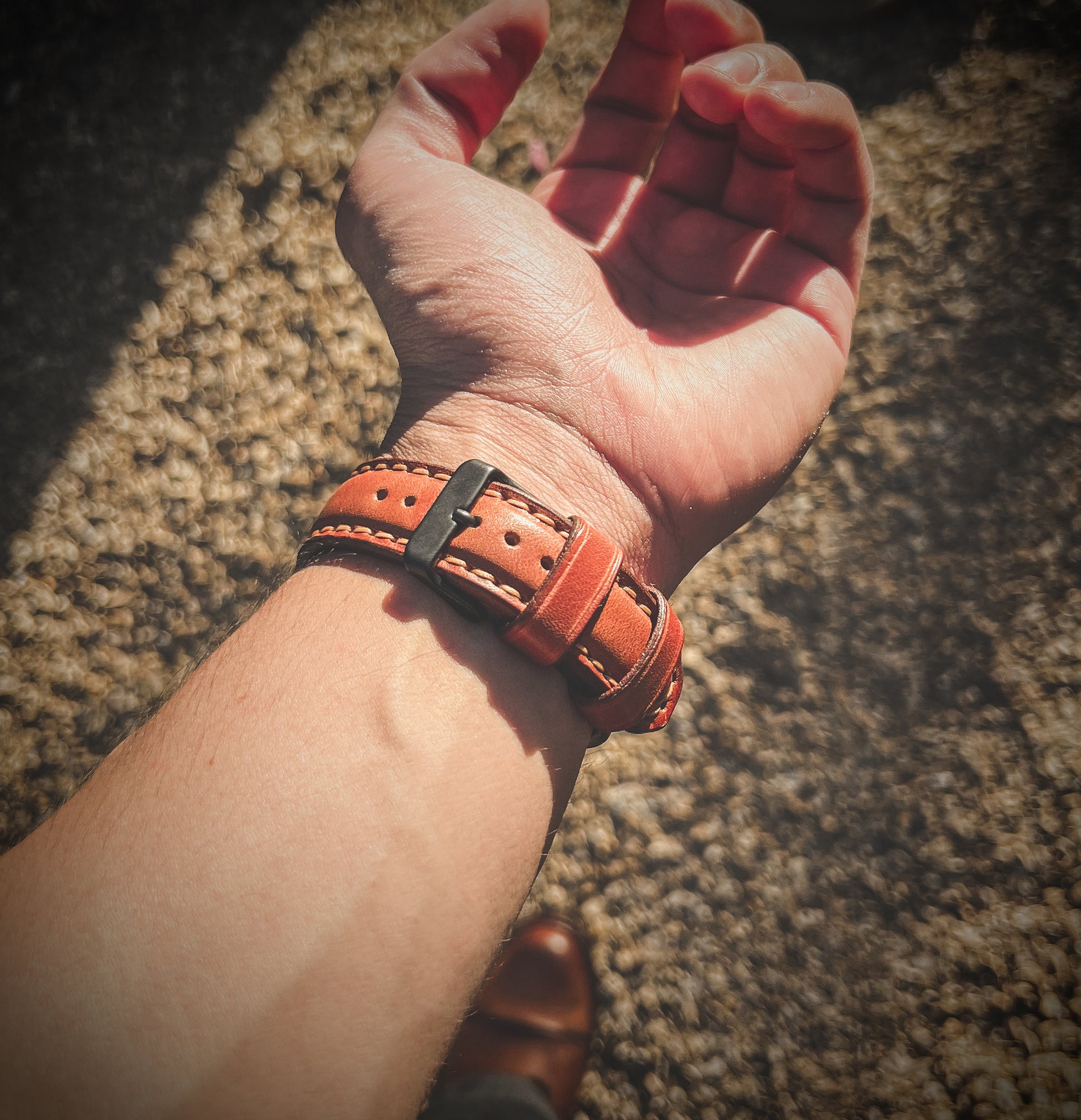 These watch straps are handcrafted using vegetable-tanned leather from Wickett and Craig sourced in the USA. Hand sewn with Ritza Tiger Thread, edges dyed and slicked with Tokonole. These watch straps will only get better with age and will develop an appealing patina over time.