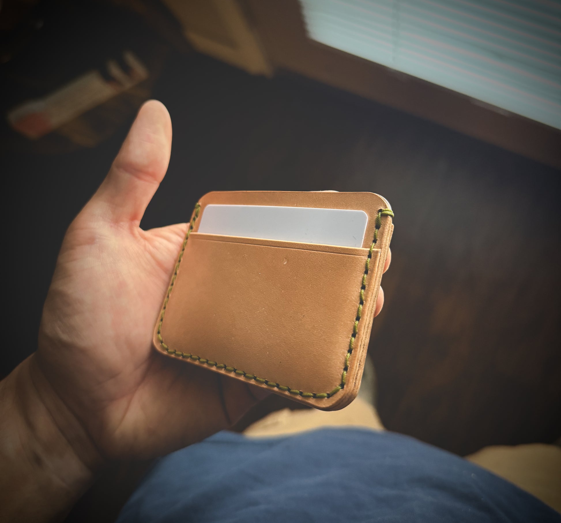 The wallet is made to order and offers 4 total pockets for your cards. The leather has a thickness of 3-4oz. This is a minimalist wallet that can take 3-5 cards at most. Expect a break in period with this wallet.