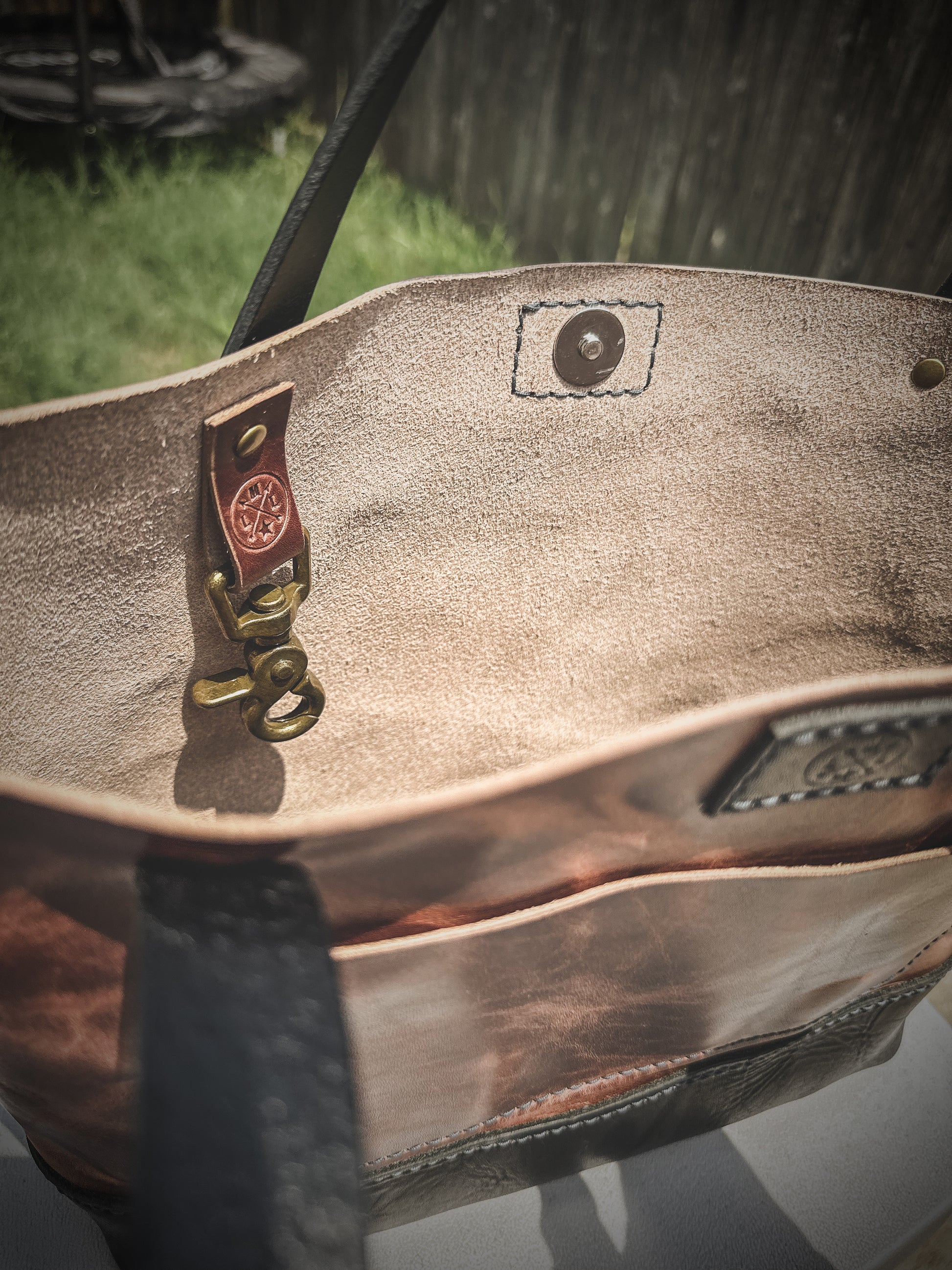 This purse is handmade to order and features a external pocket on the outside and a keychain for your keys on the inside. Handles are held together with brass rivet caps. Item is all handmade to order