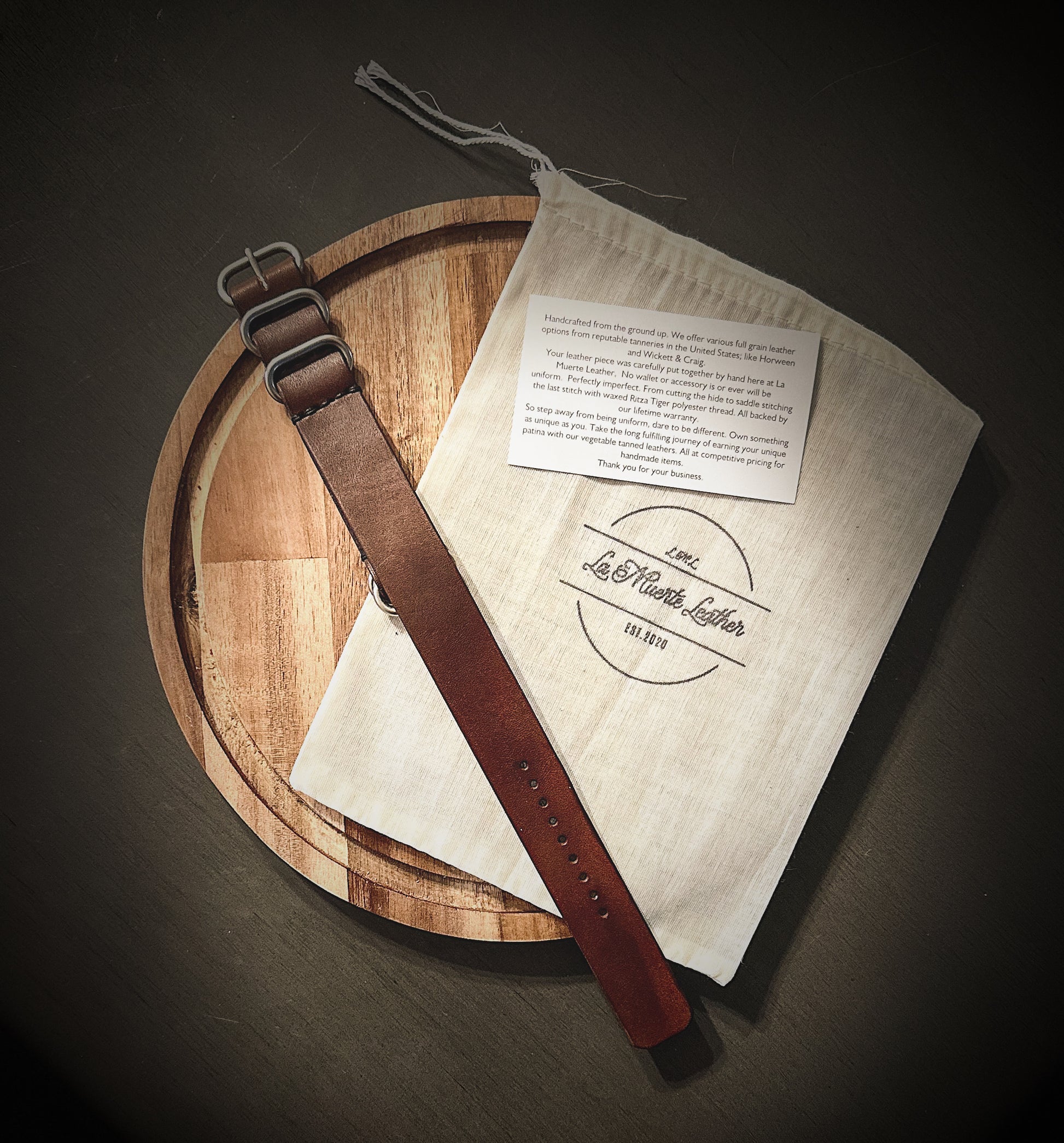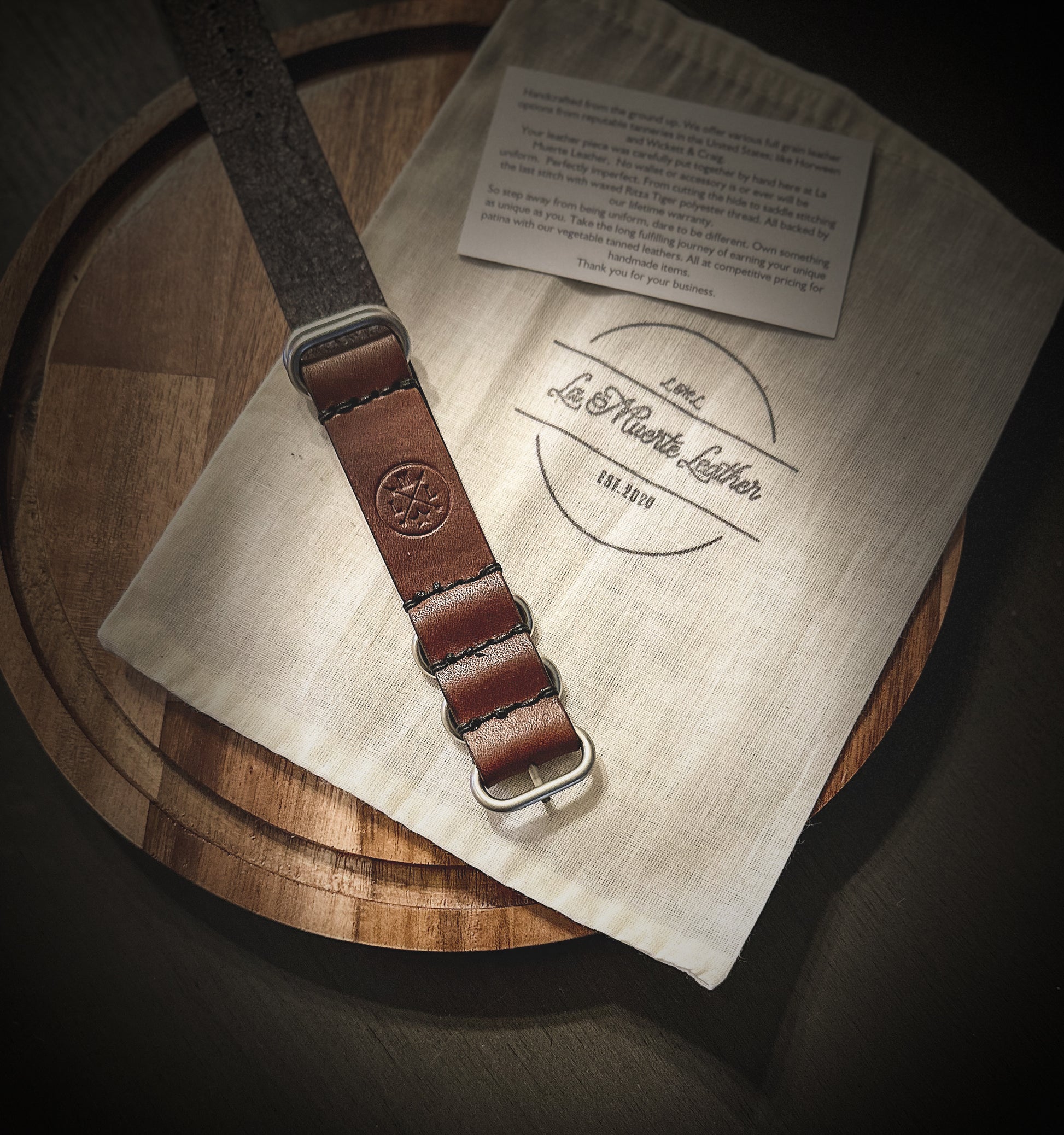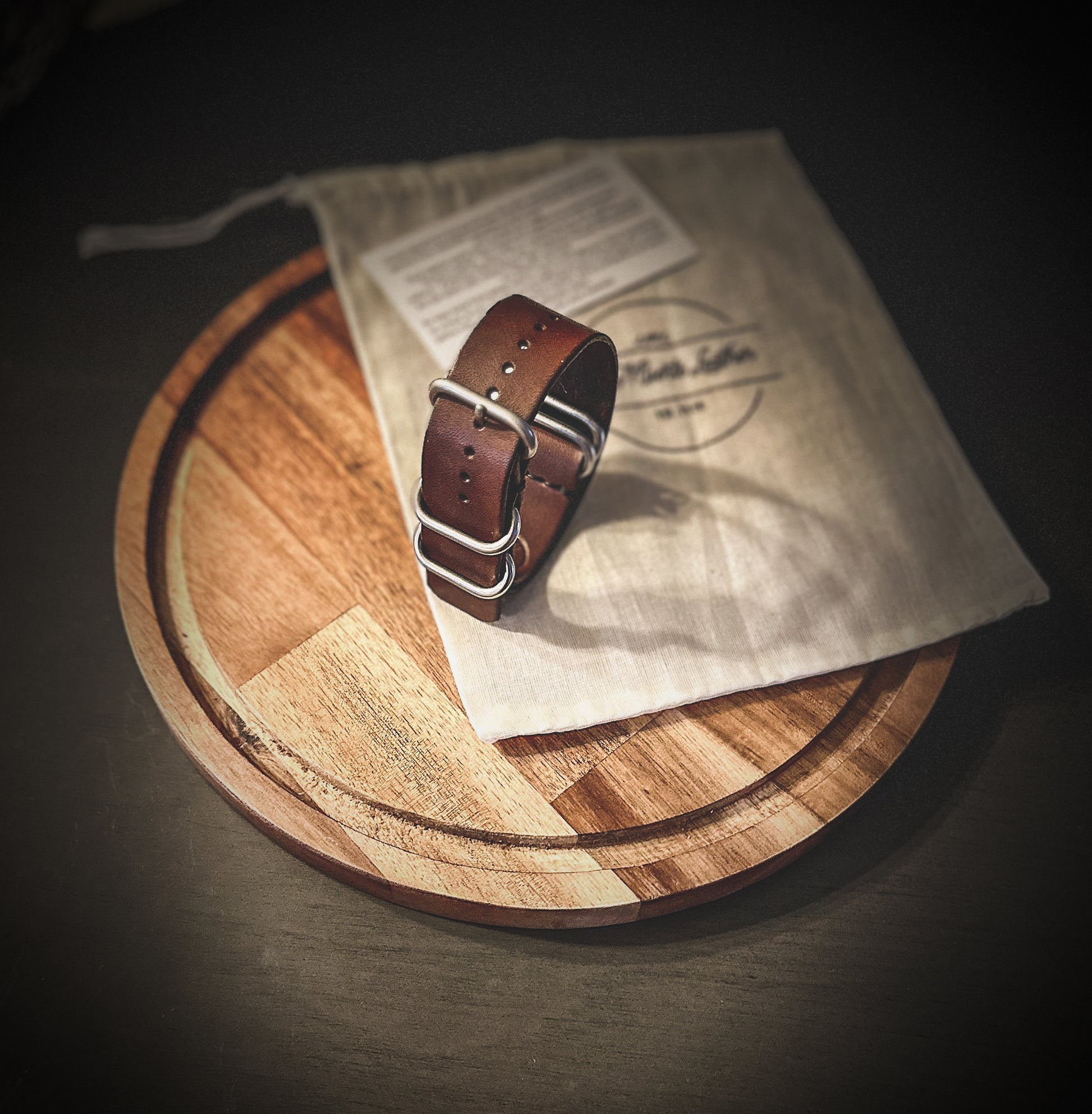 These watch straps are handmade with full-grain vegetable-tanned leather. Simplicity meets rugged, perfect for the trails or a night out in the town. Based on a famous military strap from the MoD with a leather twist for aesthetic. A nod to the boys taking down the baddies overseas.